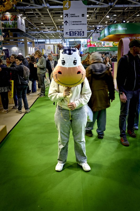 Visiteuse avec ballon vache au Salon de l'agriculture 2026