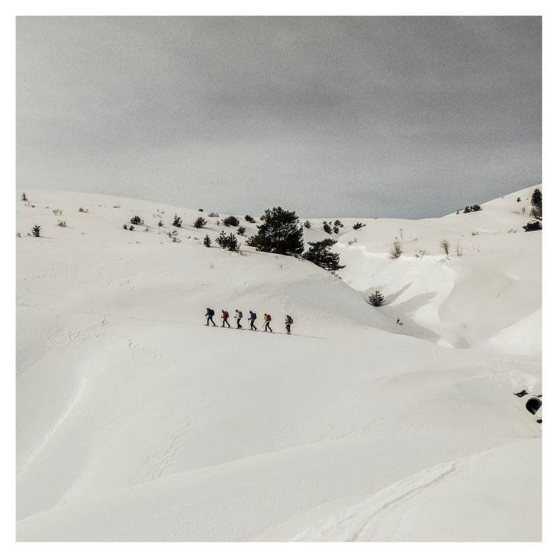 Un groupe de randonneurs à raquettes évolue sur le plateau du Négron dans les Alpes de Haute...
