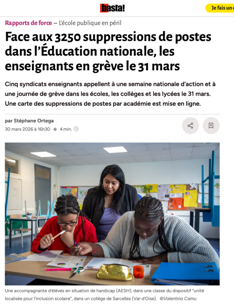Paris, le 31 mars 2026 - Des enseignants manifestent contre les suppressions de postes, la...