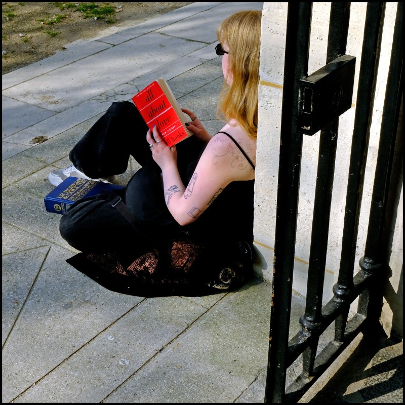 Au palais royal, une jeune femme lit all about love, à propos d'amour en français de Bell...
