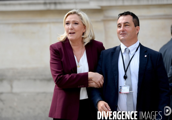 Paris le 21 juin 2022. Assemblée nationale, entrée des nouveaux députés du RN au Palais Bourbon suite aux élections législatives. Marine Le Pen avec José Beaurain député de la 4e circonscription de l’Aisne est non voyant