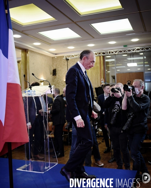 Eric Zemmour présente son programme lors d'une conférence de presse à la Maison de la Chimie à Paris le 23 mars 2022