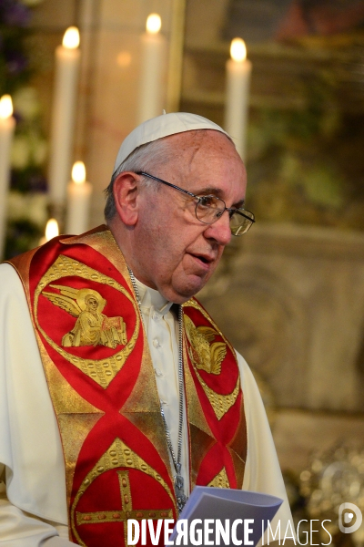 Pope Francis (Jorge Mario Bergoglio) delivers a speech at Etchmiadzin Cathedral. right, Catholicos of All Armenians Karekin II. the headquarters of the Armenian Apostolic Church, in Etchmiadzin out side Yerevan, his three-day visit with a liturgy and visit to the country's closed border with Turkey amid new tensions with Ankara over his recognition of the 1915 genocide.Yerevan. Armenia. June 24, 2016.