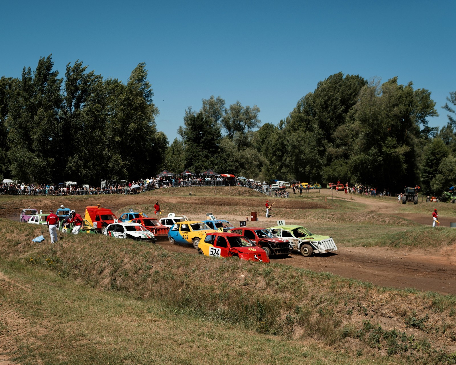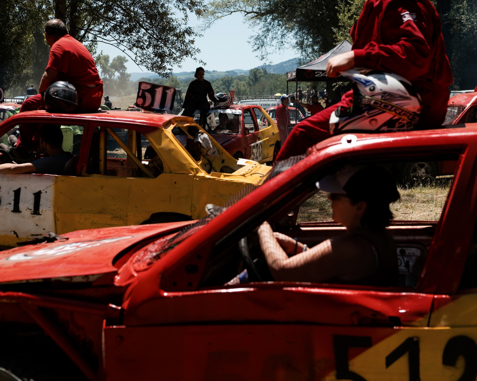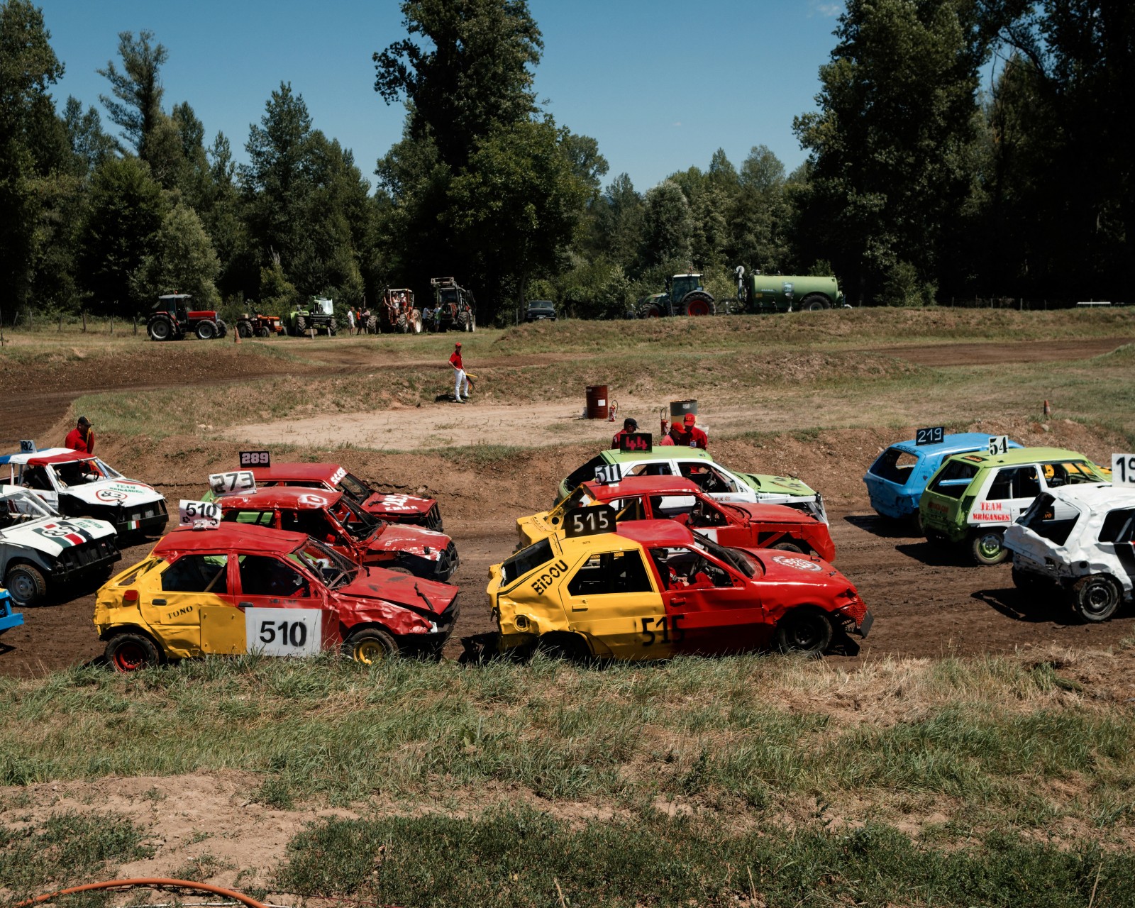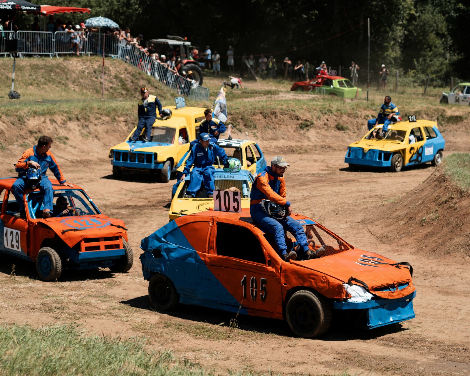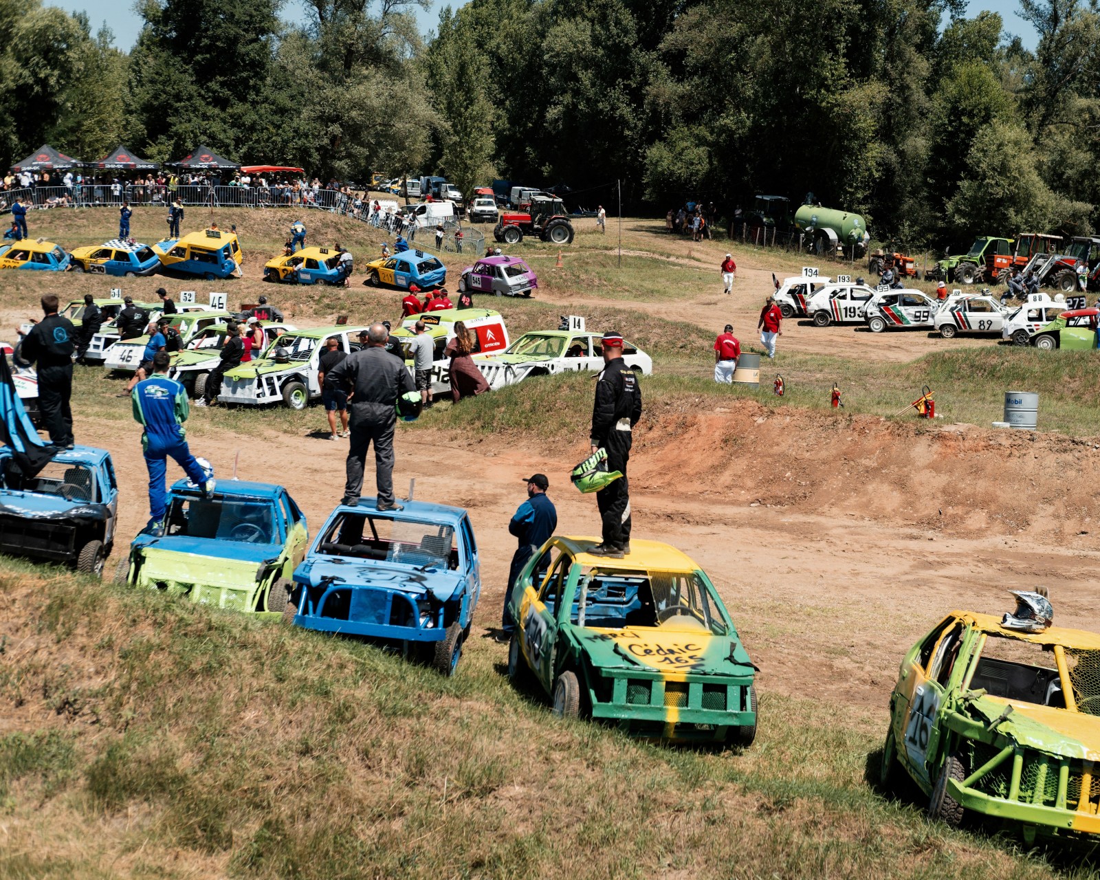 Les voitures attendent pour un autre course de la journée. Les voitures commencent à être très endommagées par les courses précédentes de la compétition. Certaines voitures feront plus de 10 courses dans la journée.