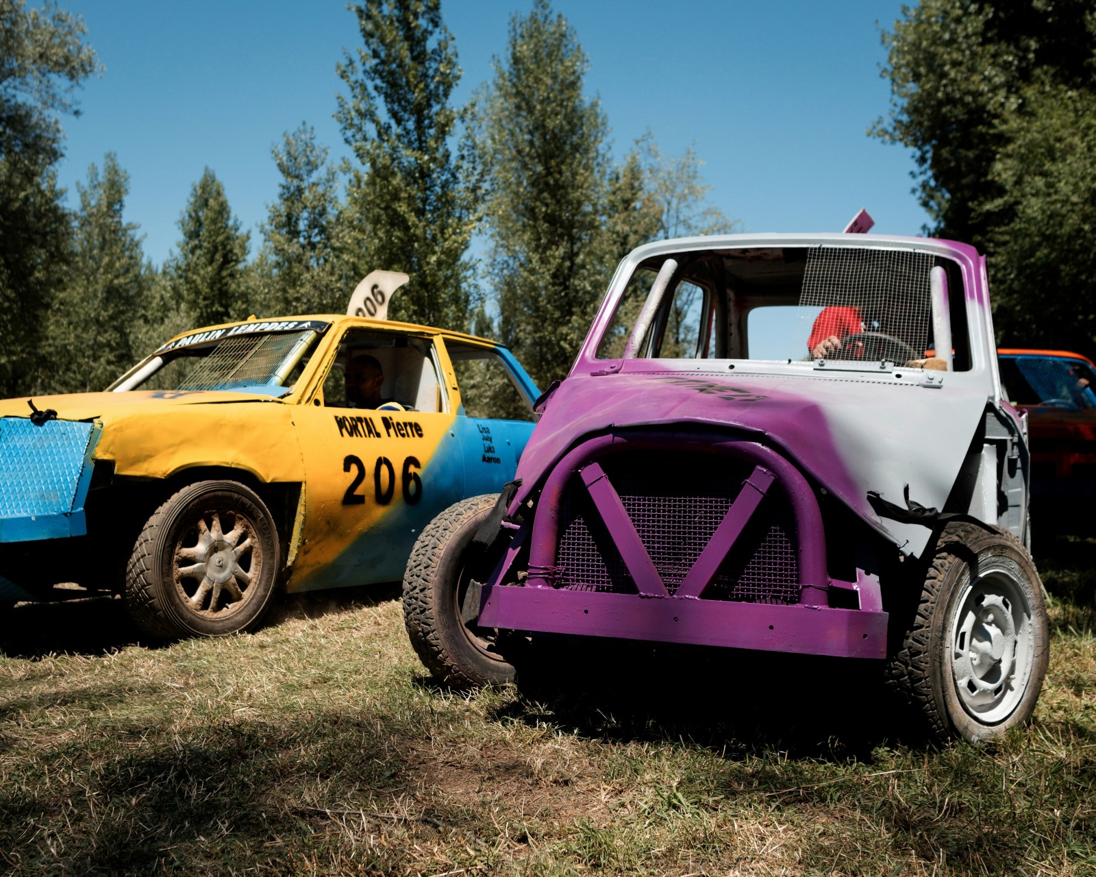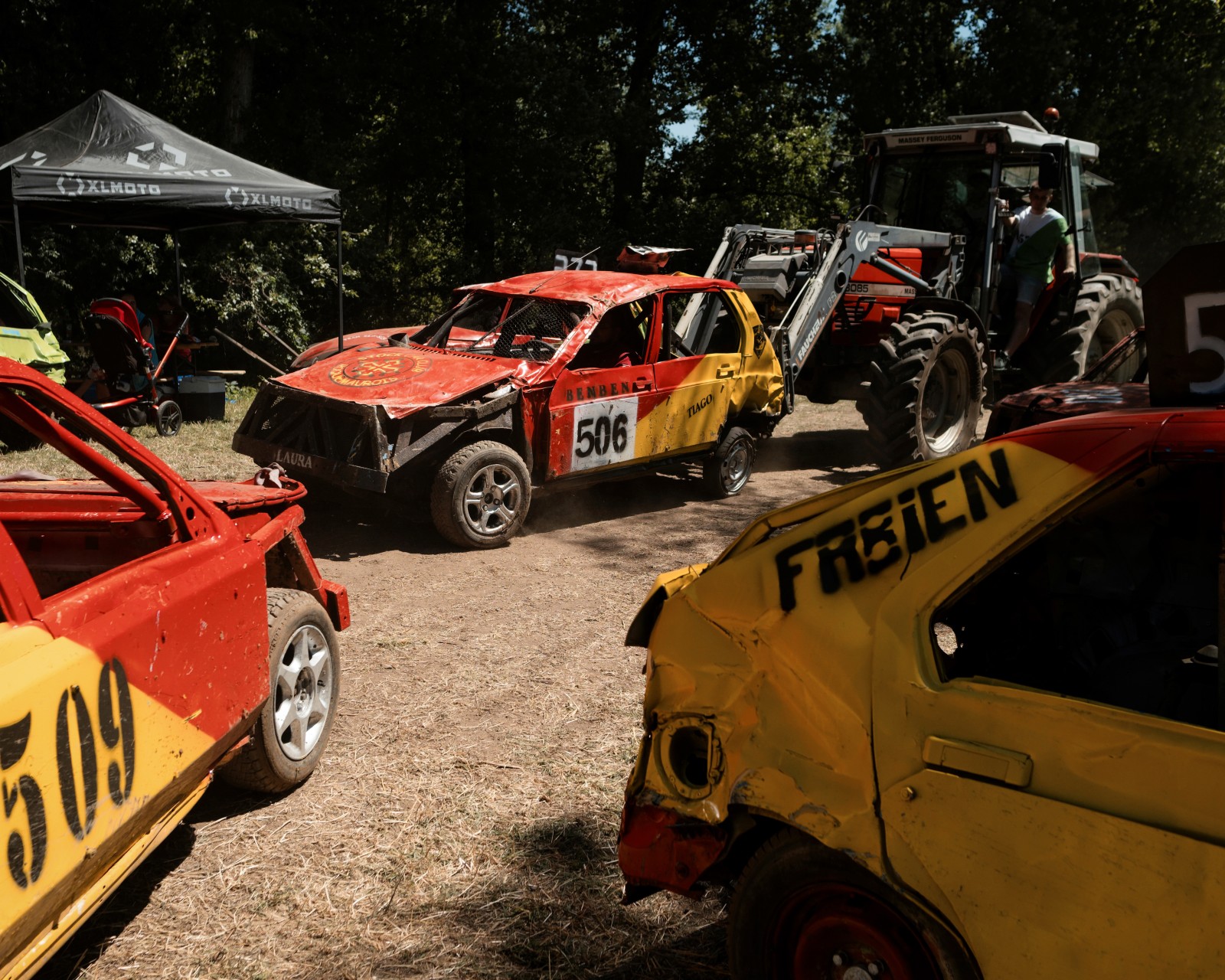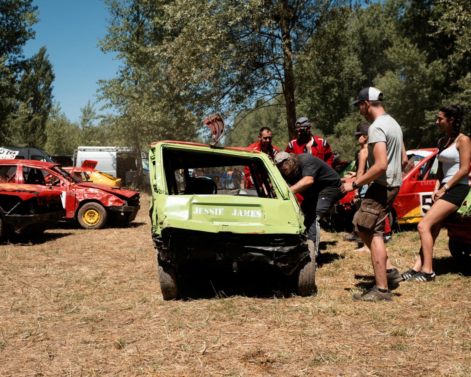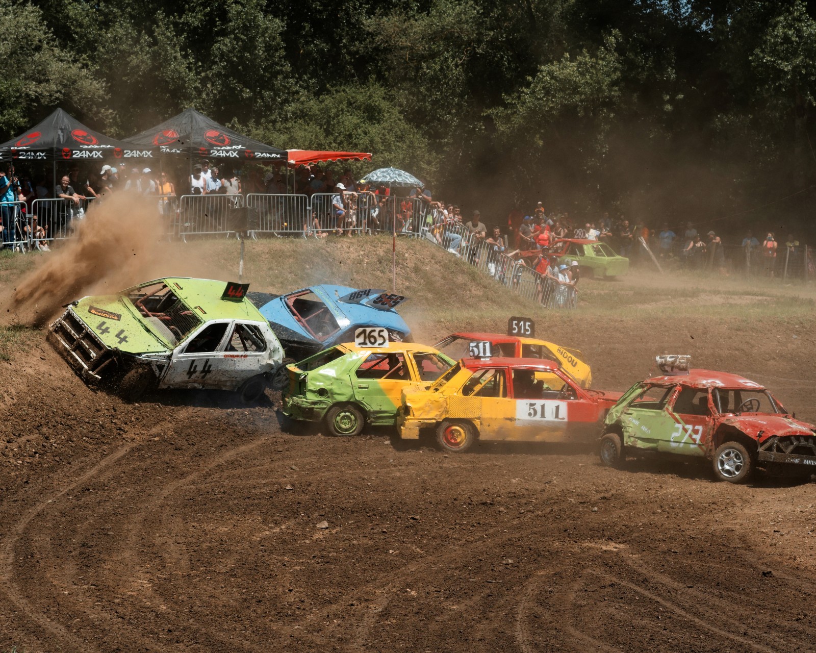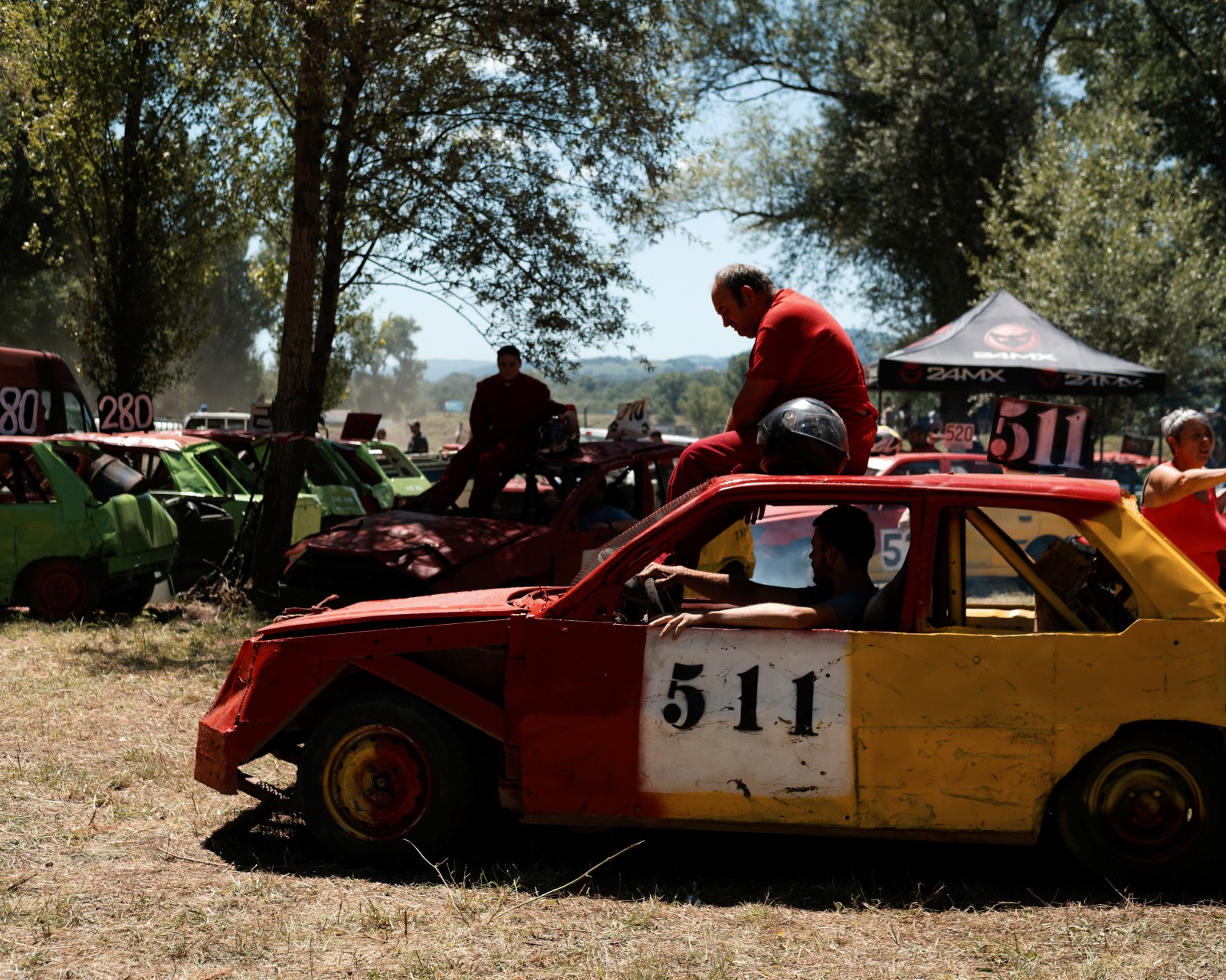 Les voitures attendent pour un autre course de la journée. Les voitures commencent à être très endommagées par les courses précédentes de la compétition. Certaines voitures feront plus de 10 courses dans la journée.