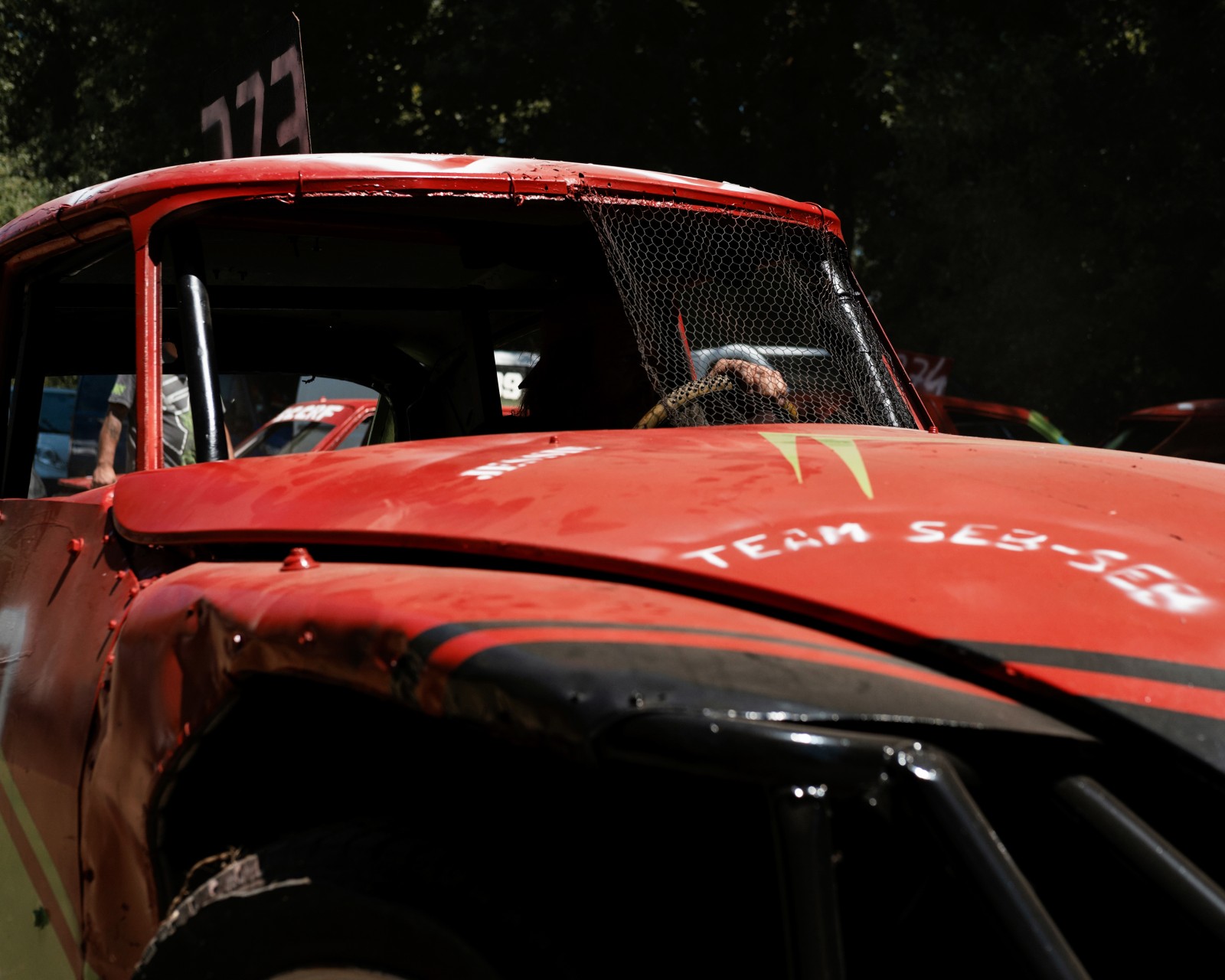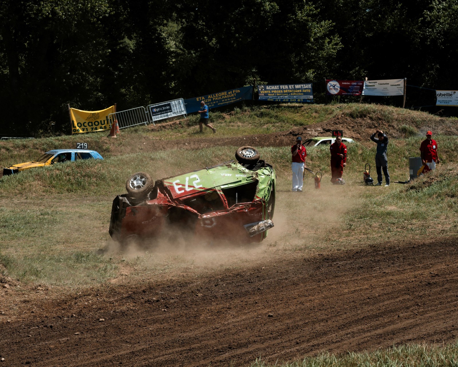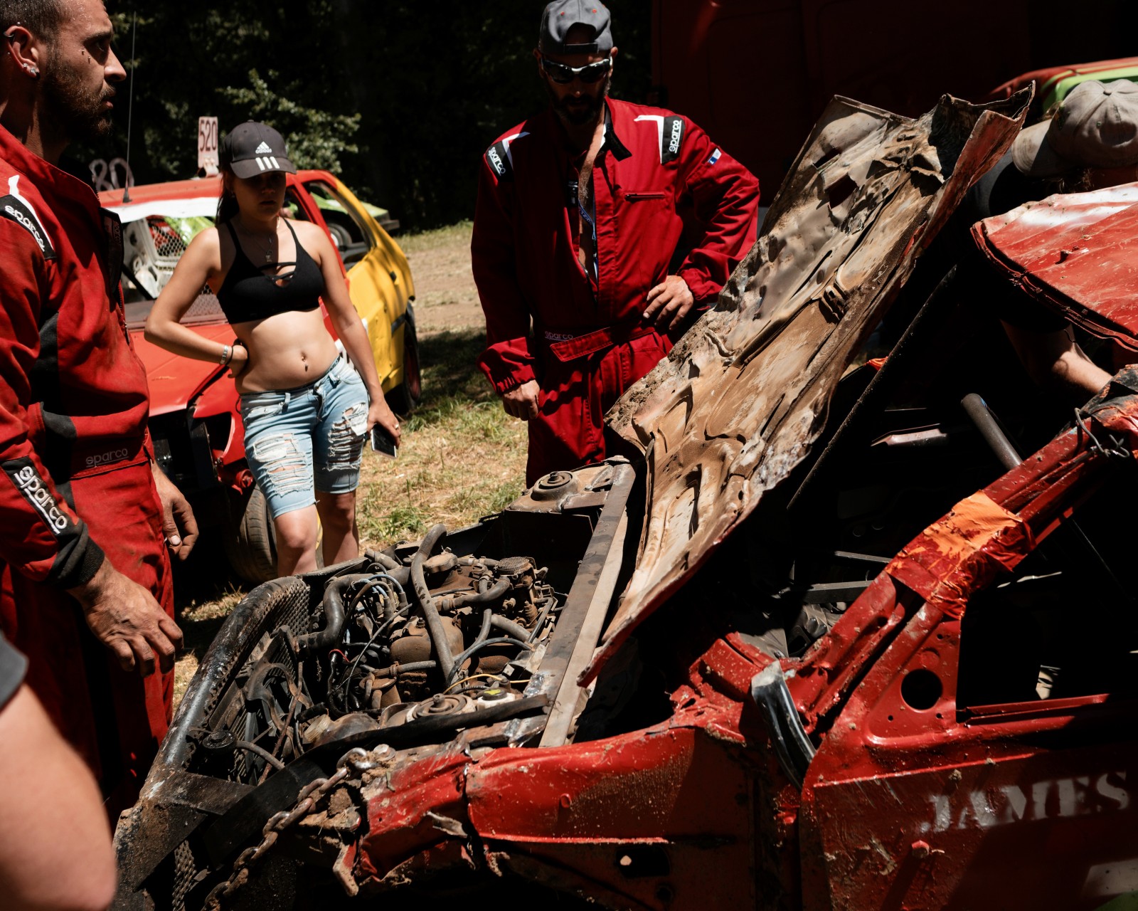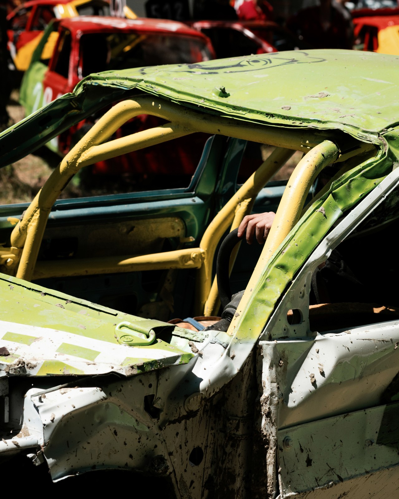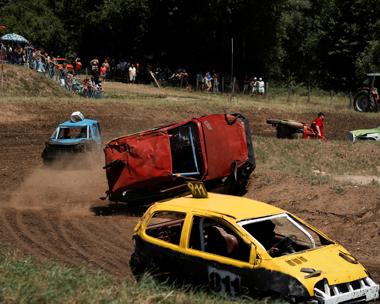 Les voitures attendent pour un autre course de la journée. Les voitures commencent à être très endommagées par les courses précédentes de la compétition. Certaines voitures feront plus de 10 courses dans la journée.