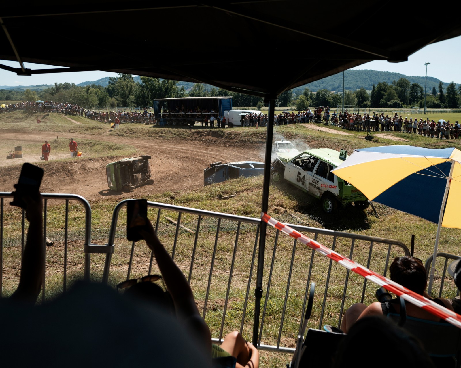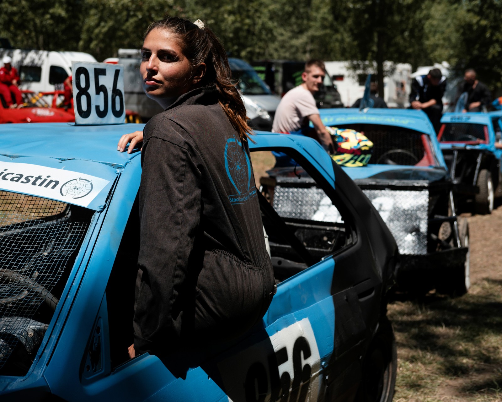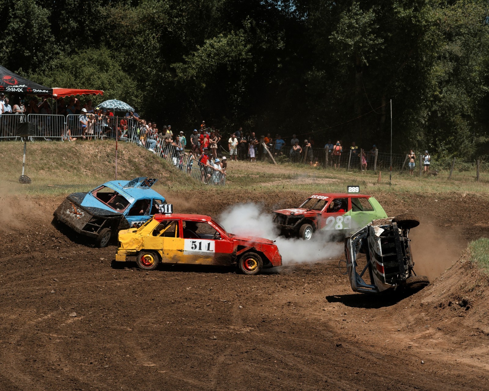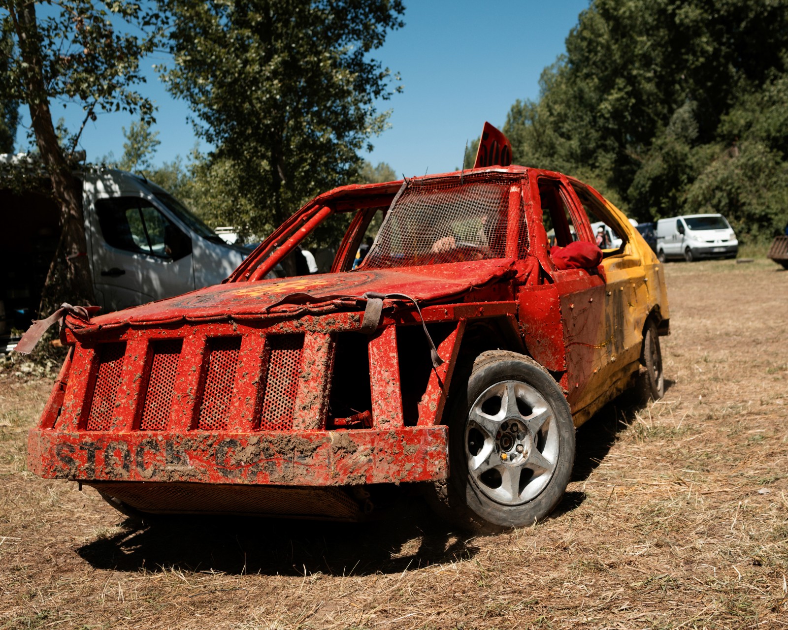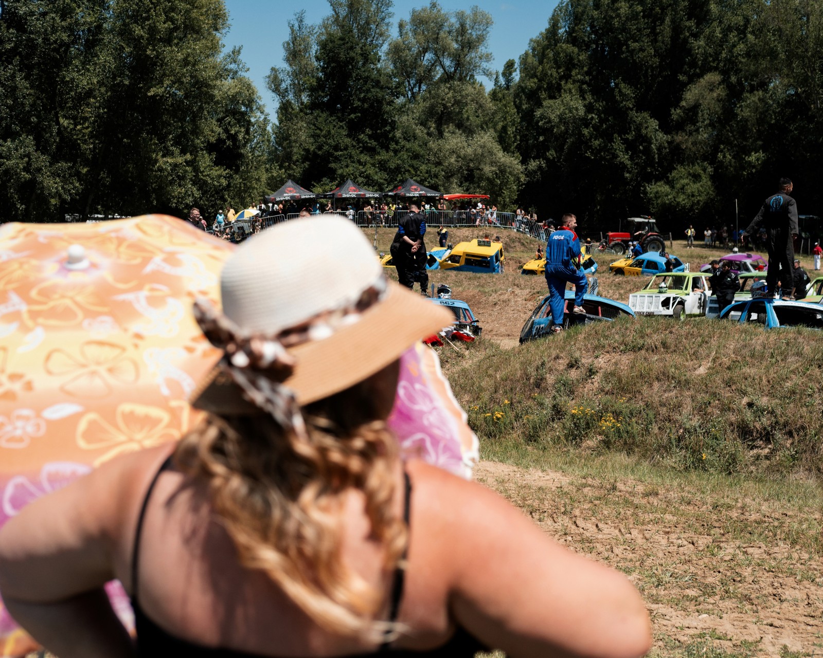 Les voitures attendent pour un autre course de la journée. Les voitures commencent à être très endommagées par les courses précédentes de la compétition. Certaines voitures feront plus de 10 courses dans la journée.