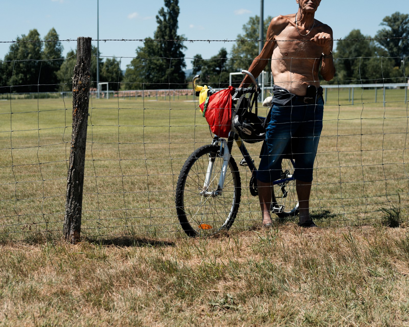Un homme regarde le spectacle de l'autre coté de la cloture du circuit. D'une main il tient son vélo, de l'autre il prend appui sur le fil barbelé.