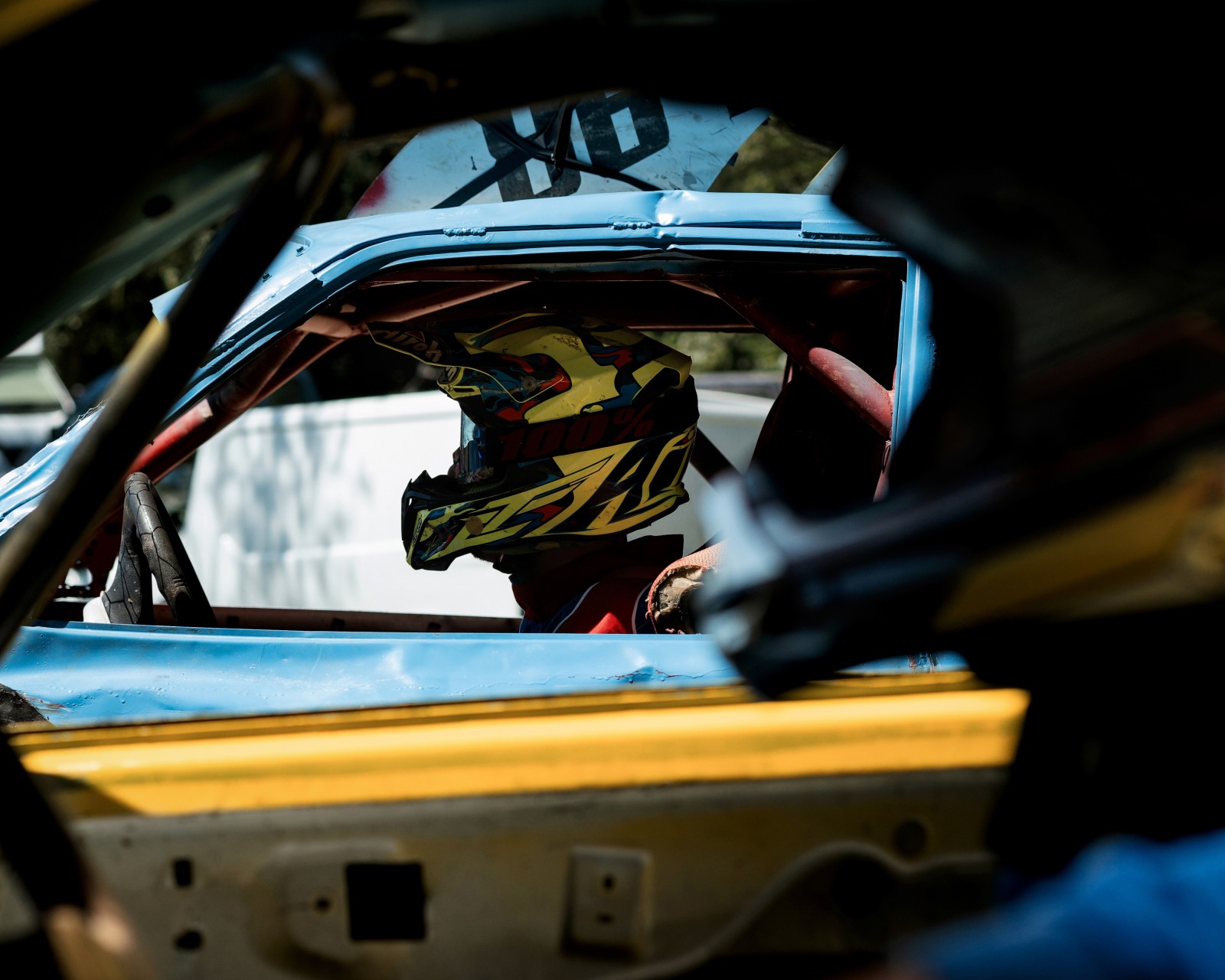 La main d'un pilote sur le volant de sa voiture déjà très endommagé par la première course attend de pouvoir repartir sur une autre course de la journée.