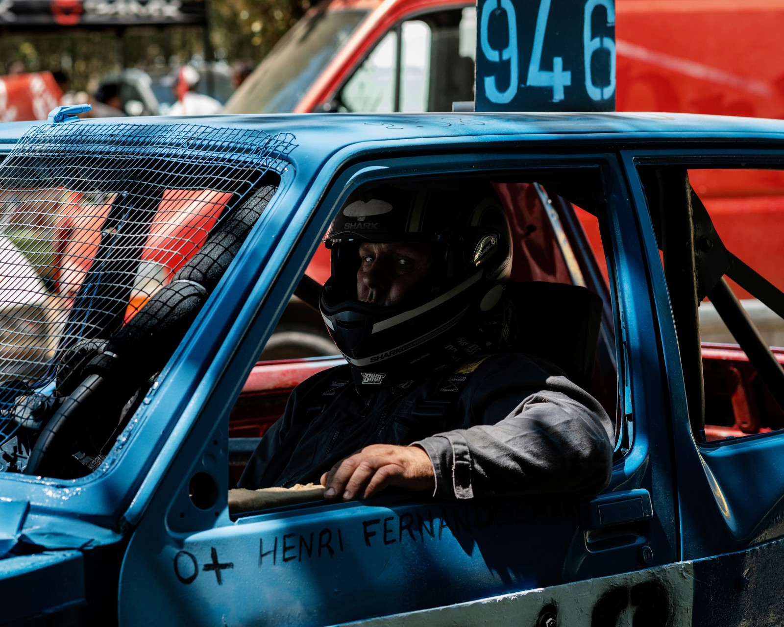 A travers son grillage de protection, la main d'un pilote d'une vielle DS est sur le volant de sa voiture attendant de pouvoir rejoindre le circuit pour une course de stock-car