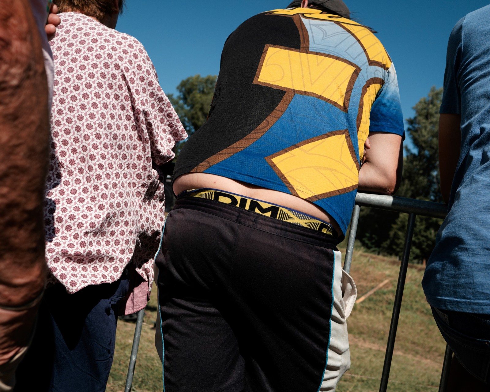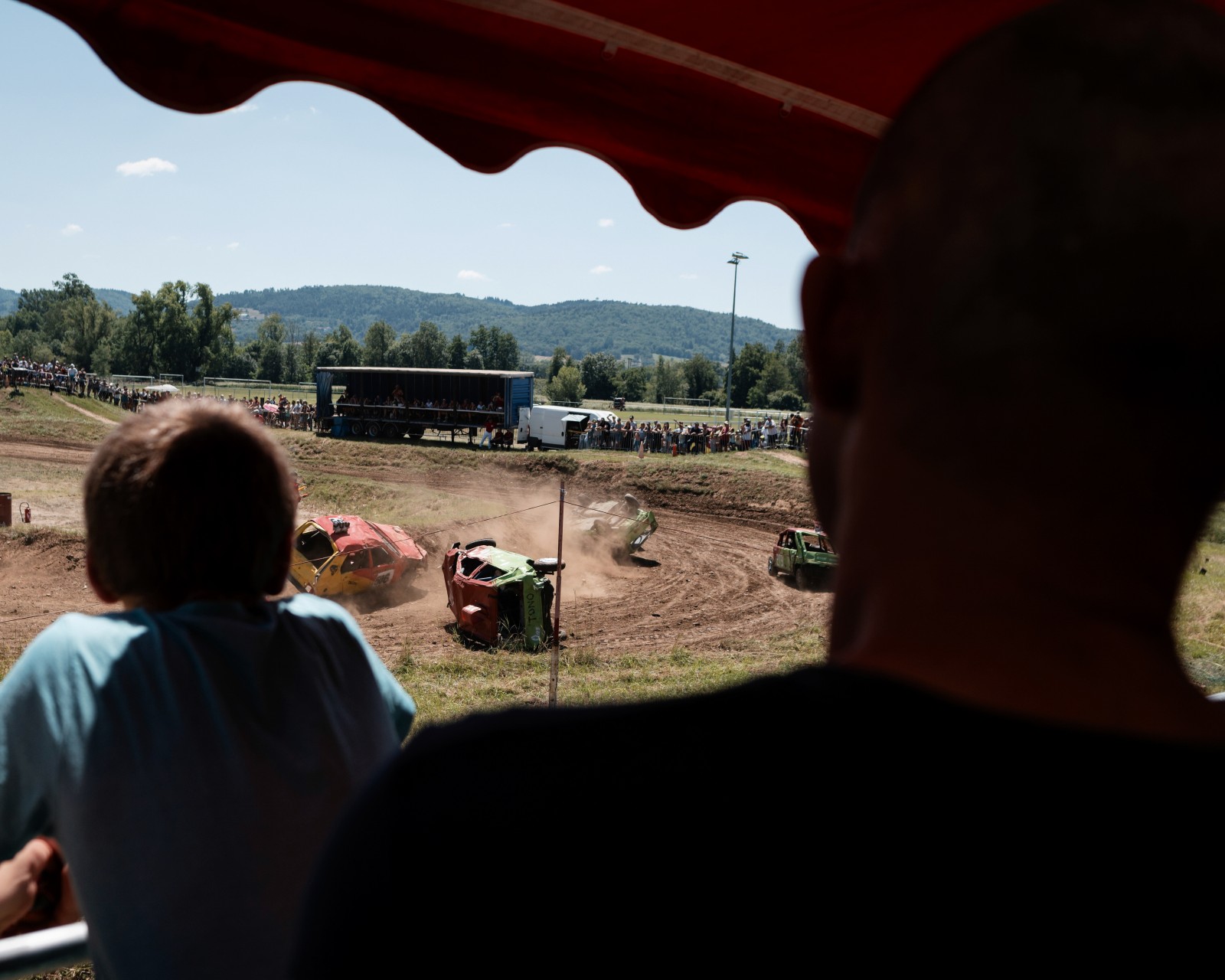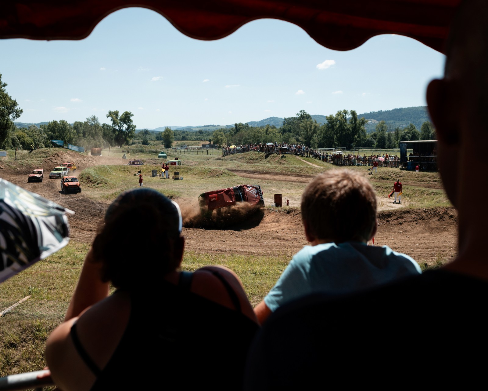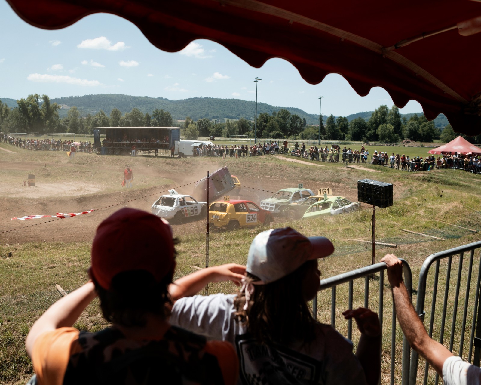 Le public de dos regardant la course de stock-car de Brioude en pleine chaleur..