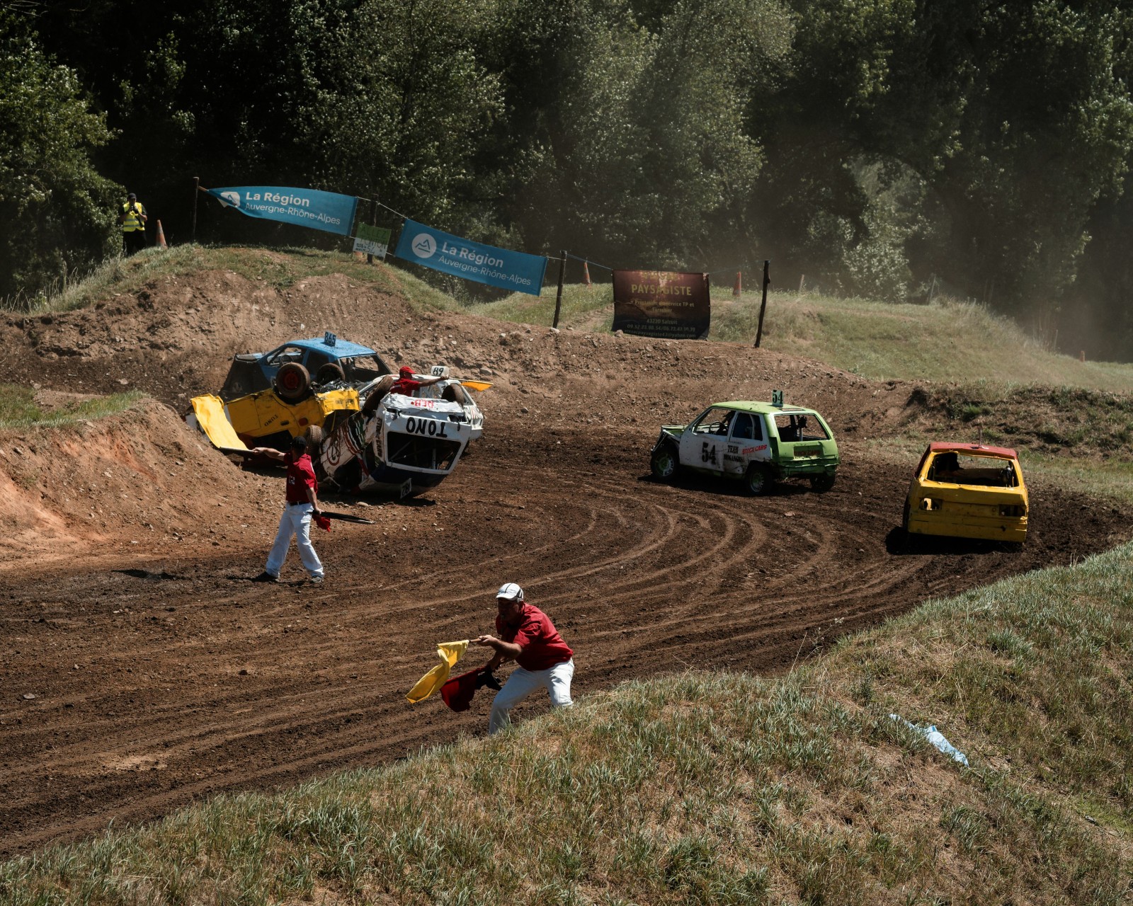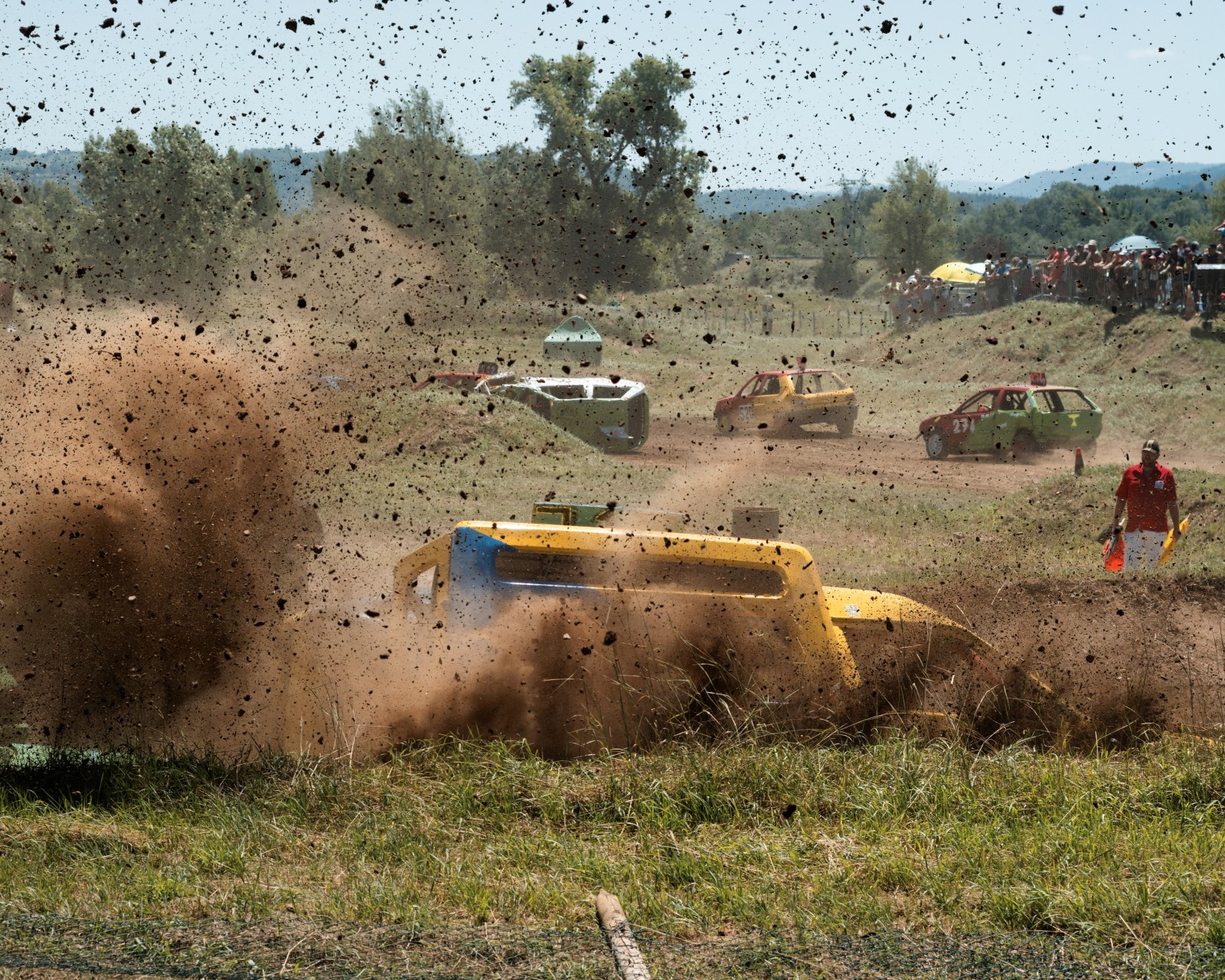 Sous le regard du public et d'un commissaire de course les voitures s'entrechoquent, le retournent, font des tonneaux pendant la course de stock-car.
