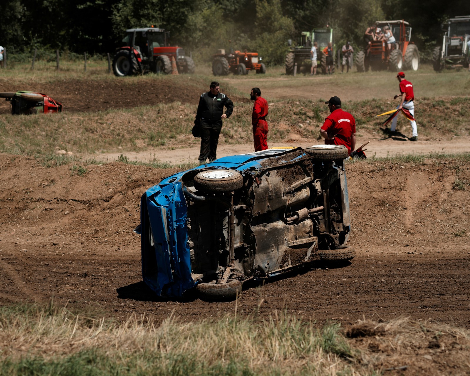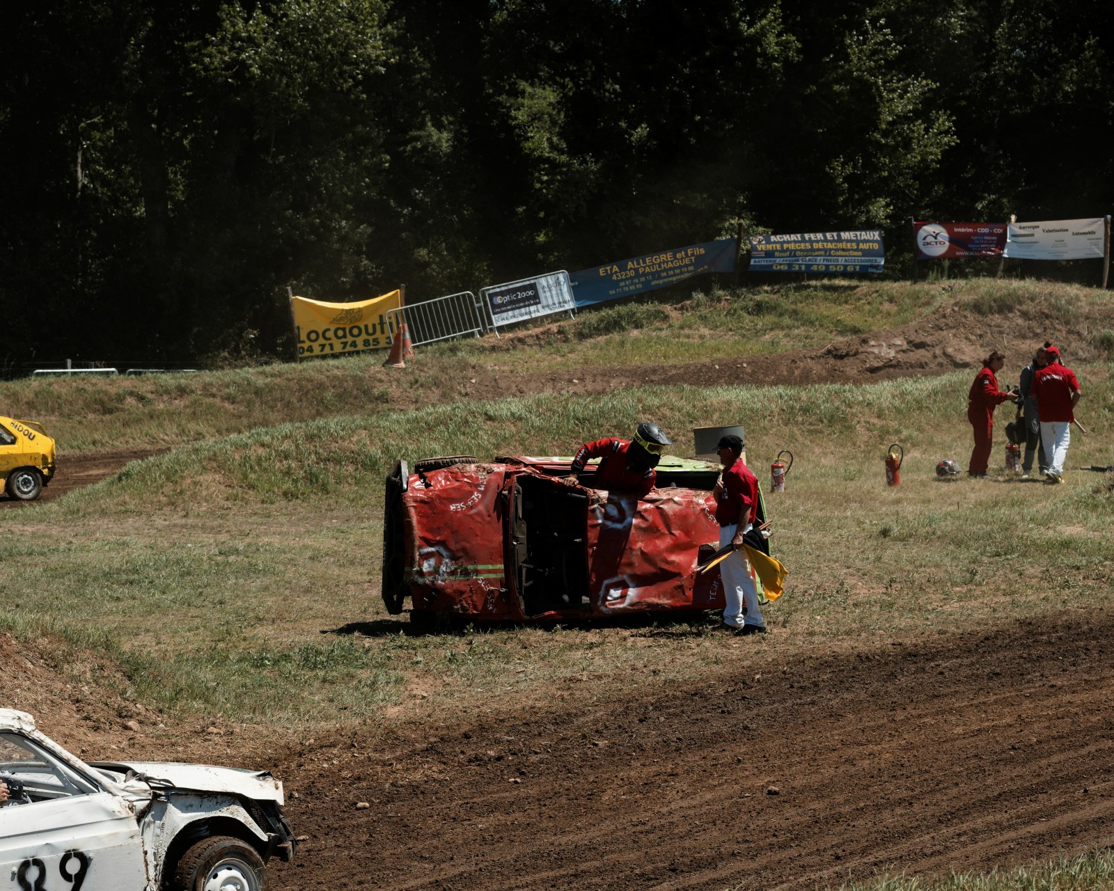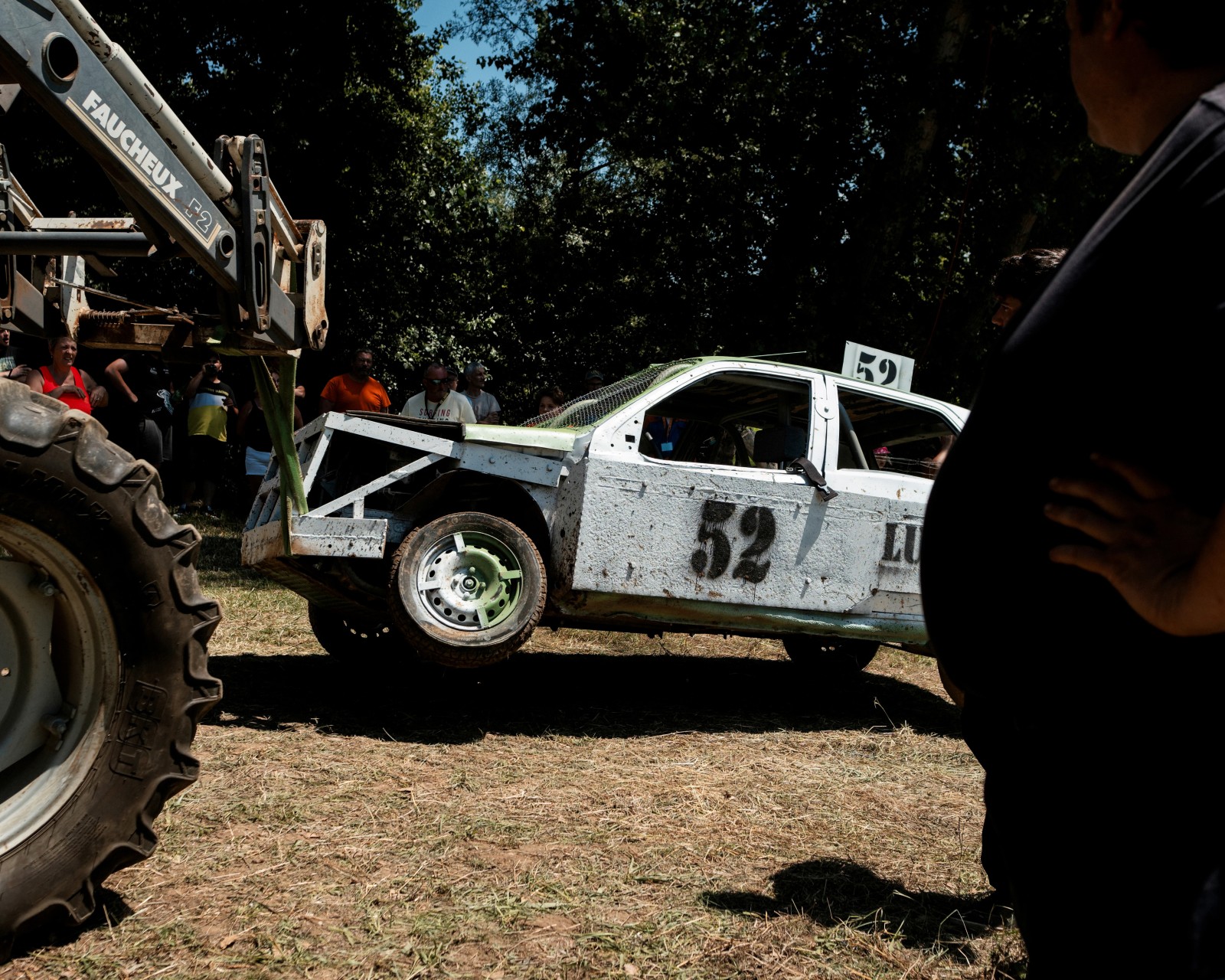 Sous le regard d'un spectateur, une voiture de l'équipe de Ganges est remorquée par un tracteur au paddock car trop endommagé par la course. Les mécaniciens tenteront de la remettre un peu en état pour la prochaine manche de la compétition.