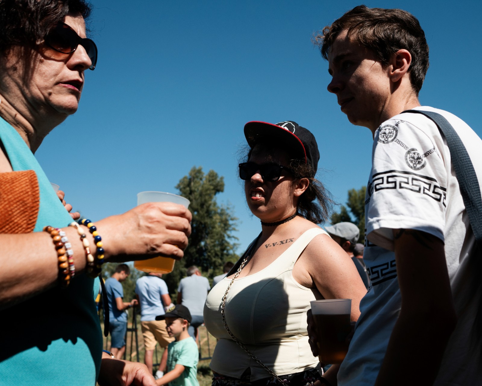 Entre deux courses le public la course de stock-car va se rafraichir à la buvette. Une femme en revient un verre de bière à la main.