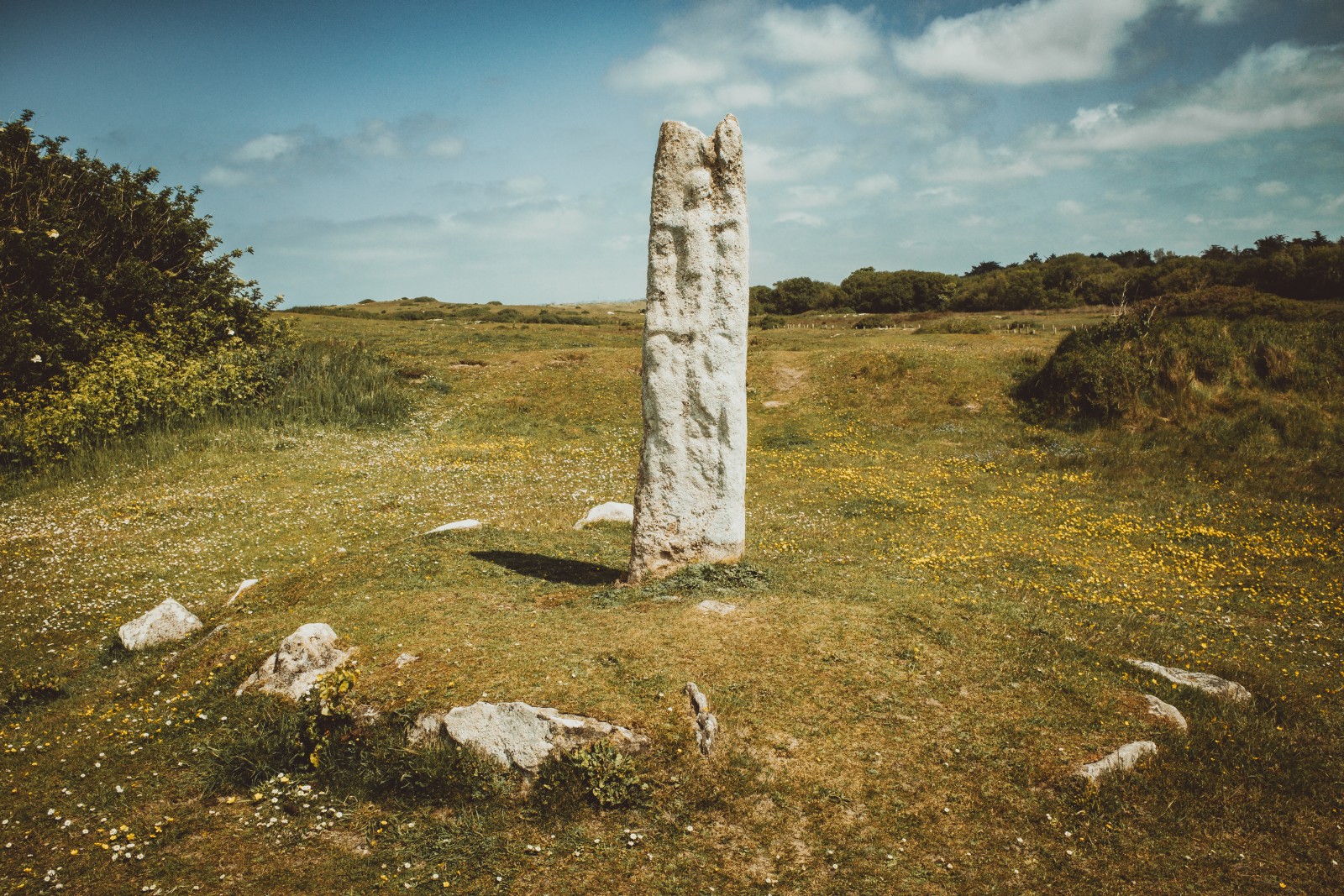 France, Finistère (29), Baie de Morlaix, Tréflez, les Dunes de Keremma (zone Natura 2000). Stèle de Saint Guévroc, pilier préhistorique christianisé où figure une crucifixion