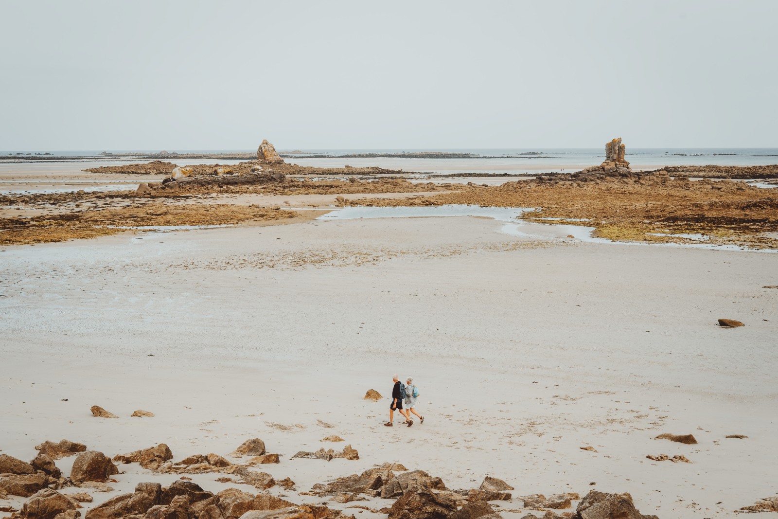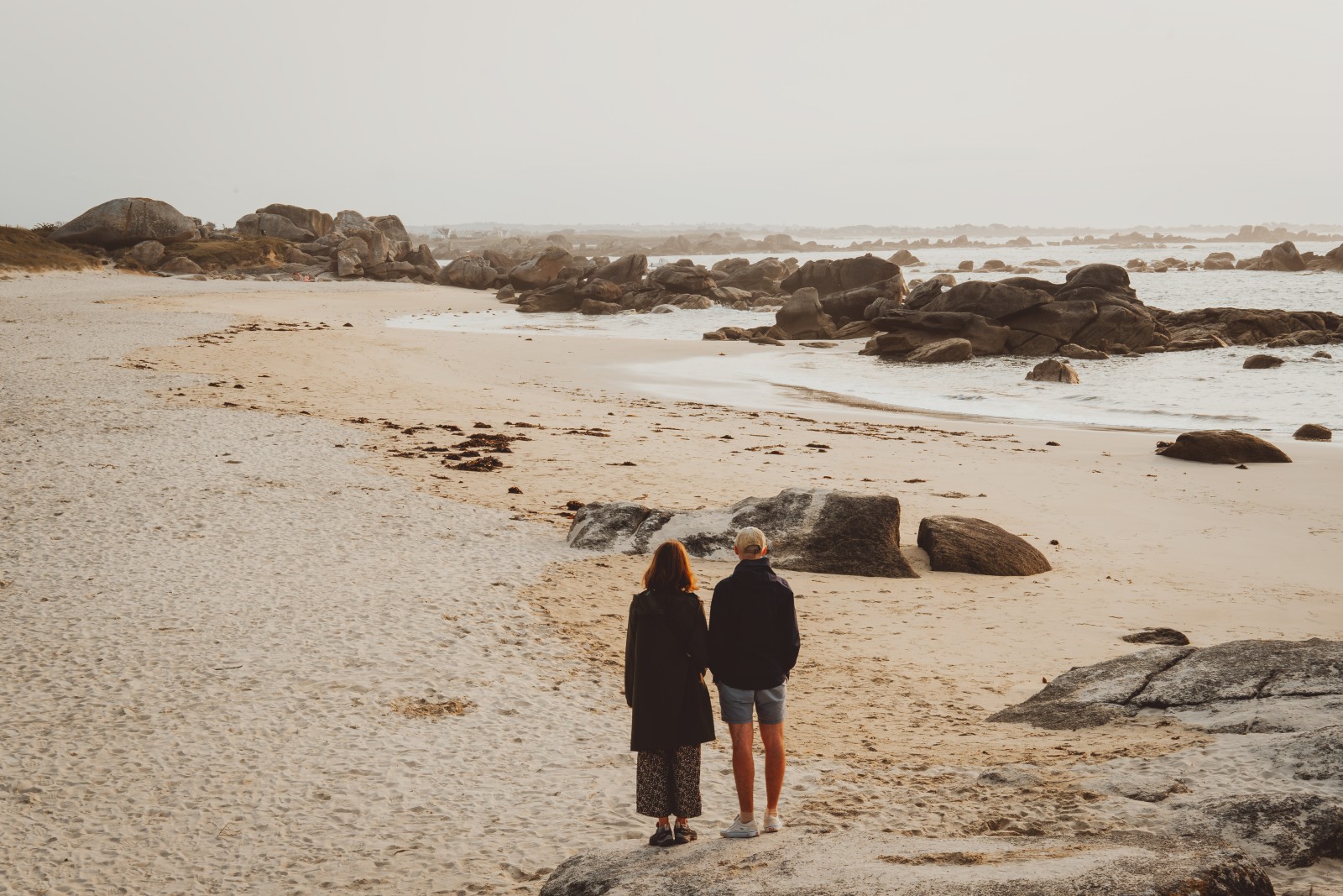 France, Finistère (29), Kerlouan, un couple se promène sur la plage de Menaham.