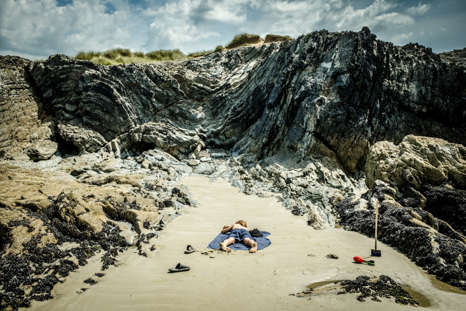 France, Bretagne, Finistère, Morgat, un enfant se repose aux pieds de l’île Salgren