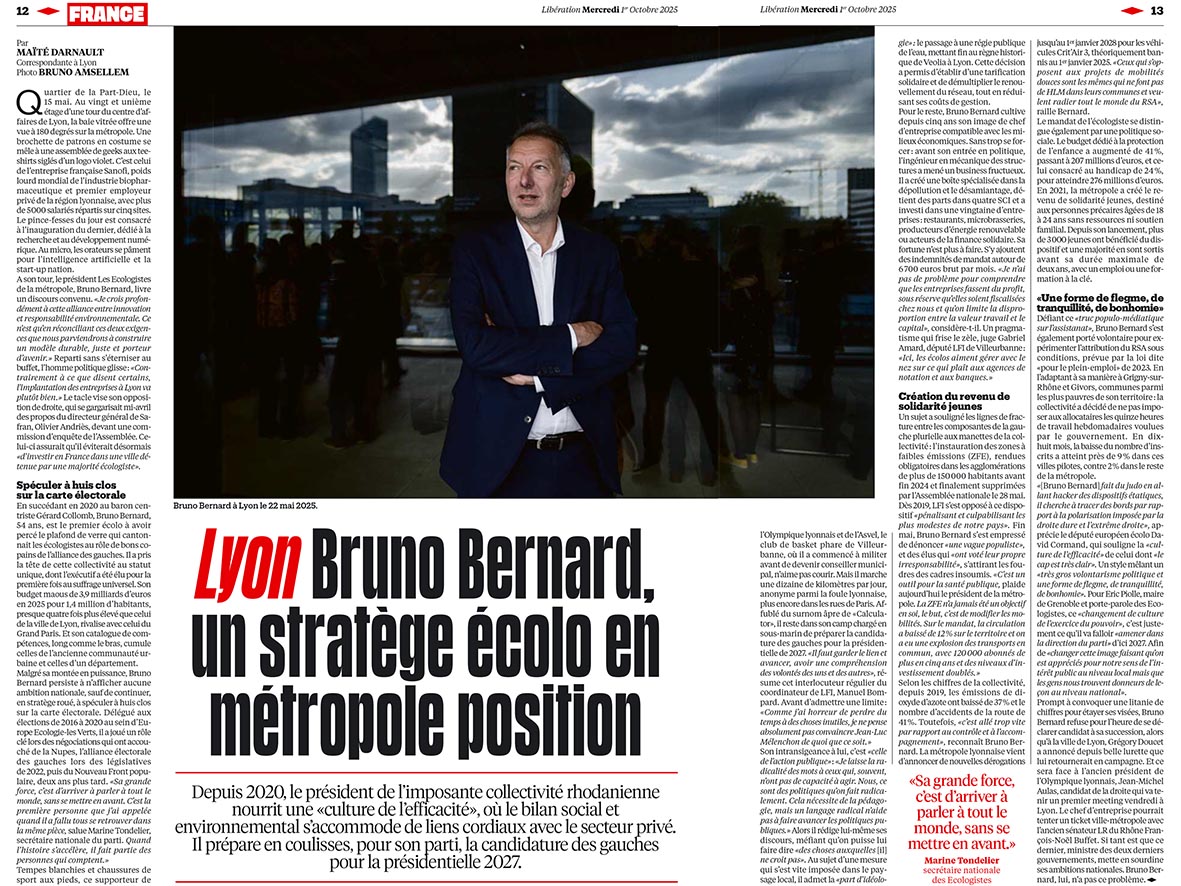 Libération : Bruno Bernard, Président de la Métropole de Lyon.