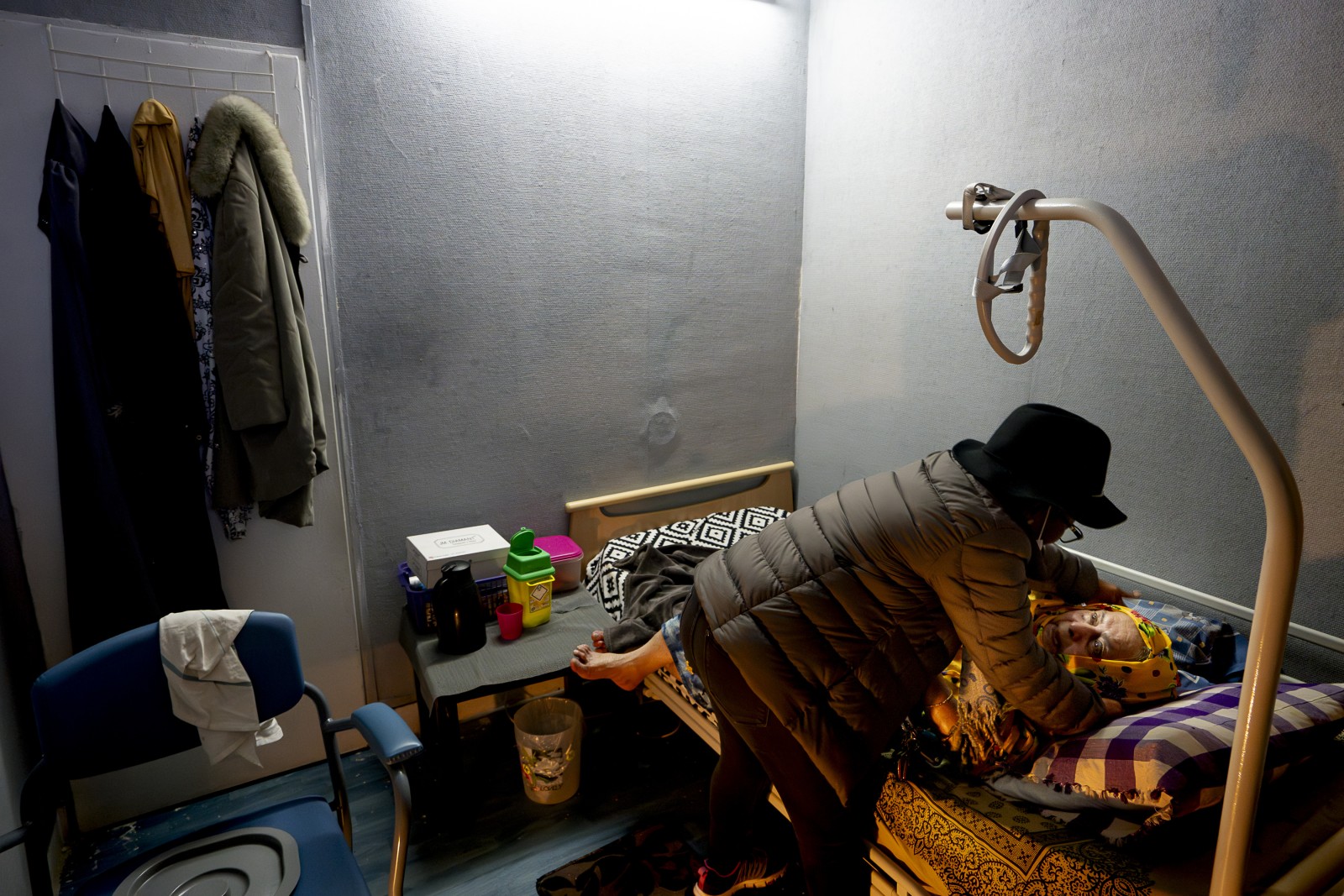 Mariama soigne M. Pierre devant sa porte car il conserve trop de choses dans son appartement pour que l’infirmière puisse y rentrer.