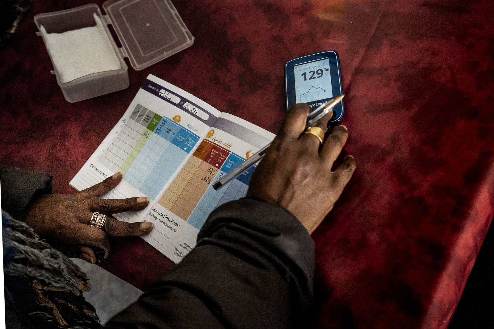 Mariama remplit un carnet de suivi de glycémie. Beaucoup de patients de Mariama parlent d’autres langues que le français. Ils ne peuvent pas lire les notices des médicaments ou remplir les documents de suivi de traitement.
