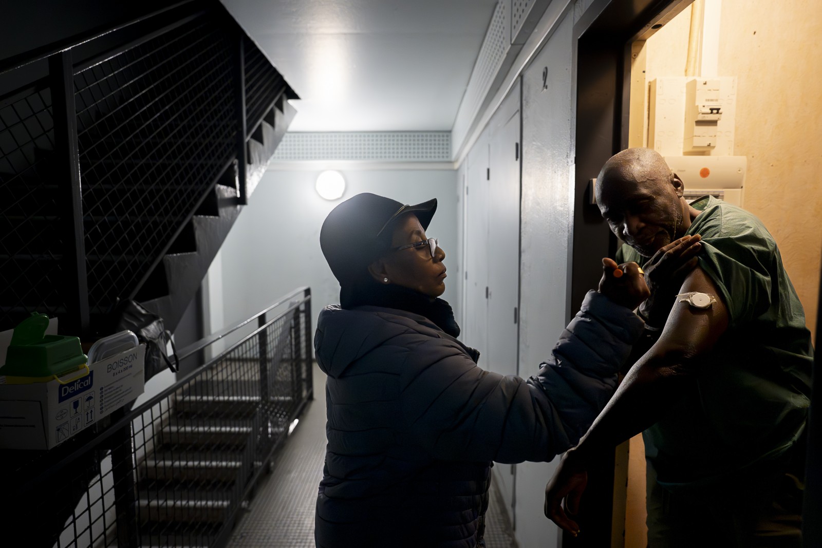 Après plusieurs visites de la médecin, la locataire se plaint de problèmes de santé et accepte de sortir sur le palier se faire examiner. La consultation se tient alors dans l’escalier. Pour Charlotte, « Aller vers » les habitants de La Courneuve permet de leur proposer des soins avant que les difficultés ne soient installées et plus complexes à traiter.