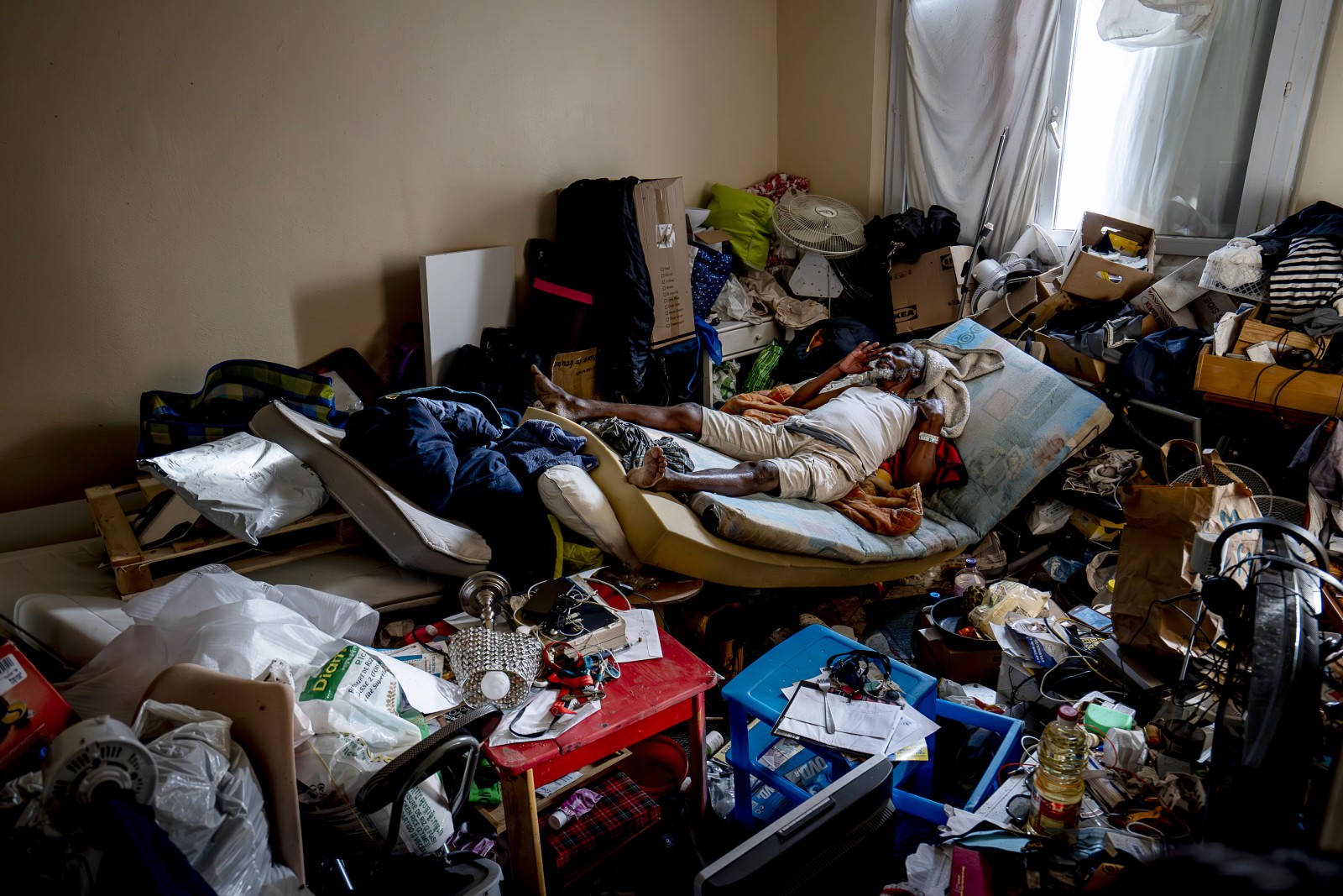 M. Pierre fait la sieste dans son appartement encombré d’objets qu’il ramasse chaque jour dans la rue.