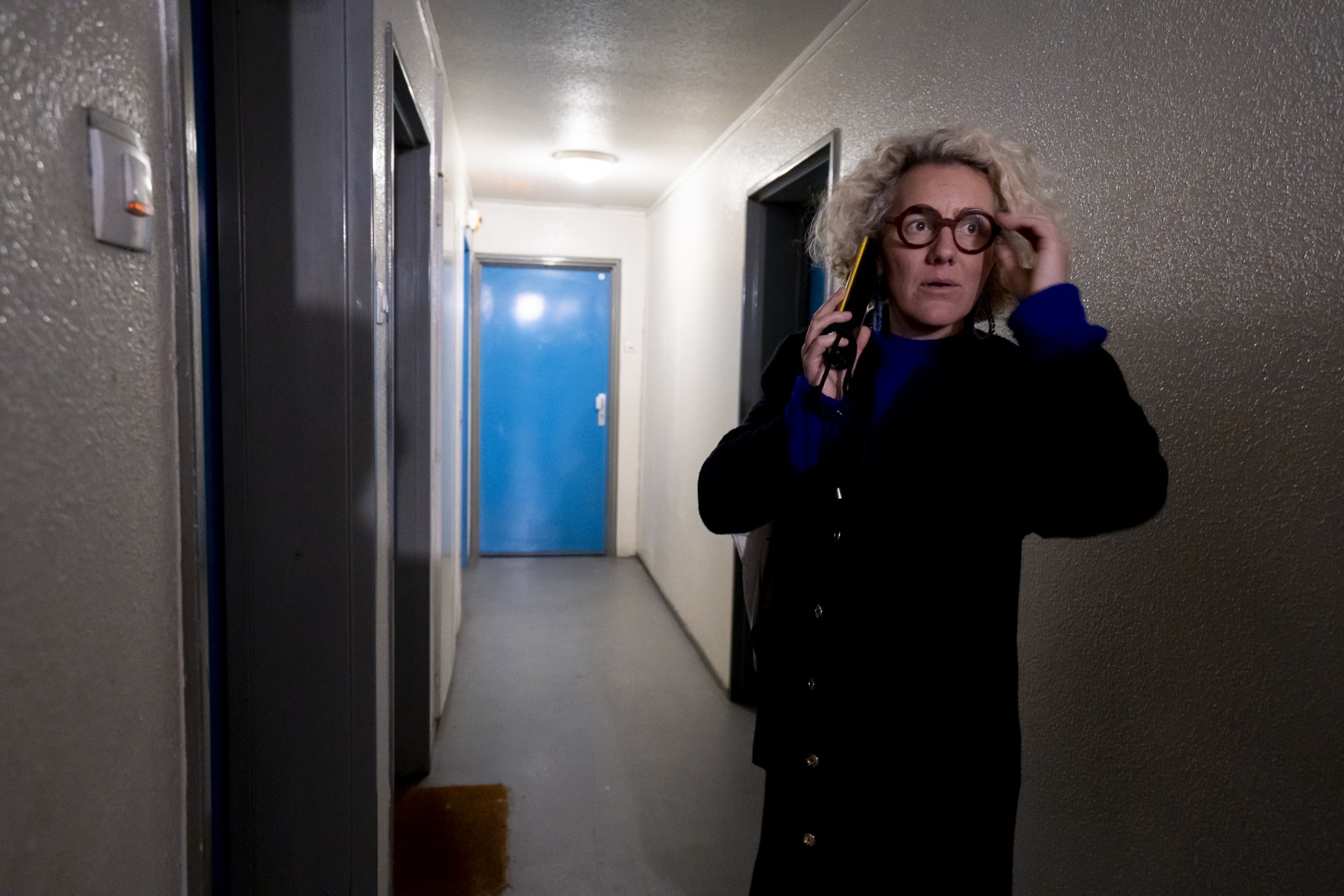 Charlotte, égarée, cherche la porte d’une patiente. Une fois par semaine, Charlotte sort de son cabinet pour aller au devant de personnes qui ont des difficultés d'accès aux soins et se sont coupées des services de santé.