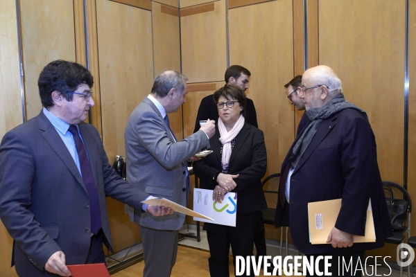 Jean-Luc Moudenc, Président de France urbaine avec Martine Aubry , maire de Lille, André Rossinot, president du grand Nancy , reunion à Bercy des élus des grandes villes et des agglomérations au sujet de l'impact des manifestations des « gilets jaunes » sur les habitants, les commerçants et les artisans.