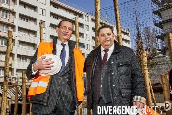 Jérôme Bédier, président de Seqens , Bruno Arcadipane, président d'Action Logement, Visite d'un chantier par Geoffroy Roux de Bezieux Medef, réhabilitation et la résidentialisation d'une résidence de 138 logements, la résidence de Jalancloud aux Lilas en Seine-Saint-Denis (93), gérée par l'opérateur Seqens (Groupe Action Logement).