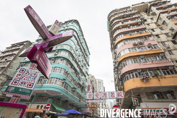 Hong Kong, quartier de Sham Shui Po, vie quotidienne. Neighborhood life. Street life. Signalisation pour pietons.