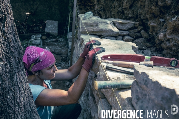 Avec patience et minutie les muraillers montent des murs sans liants. Ce savoir faire est classe au patrimoine universel immateriel sur la liste de l'UNESCO. Ces murs sont capables de supporter le passage routier des camions de 13 tonnes. Ils sont entierement recyclable, demandent tres peu d'energie fossile (transport des pierres uniquement), se construisent en materiaux locaux reutilisables. Ici Lucile BONIN est en AFEST Action de Formation En Situation de Travail.