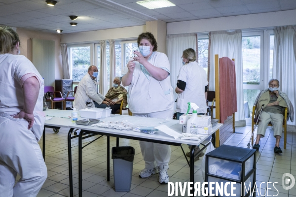 EHPAD d Ancy-le-Franc (Yonne). 28 .01.2021. Seance de vaccination d'une trentaine de residents avec le vaccin ARN Messager des laboratoires Pfizer BioNtech