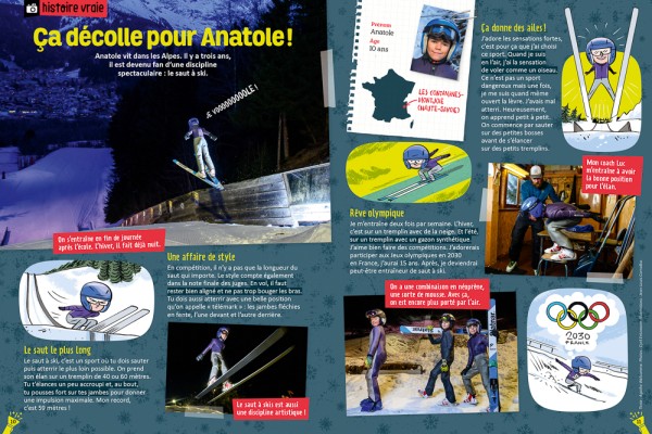 Reportage pour Astrapi sur le saut à ski pratiqué par les enfants aux Contamines