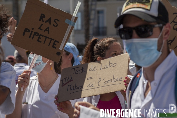 Manifestation du personnel soignant à Marseille. Plusieurs syndicats et collectifs hospitaliers ont appelé à une nouvelle journée d'action nationale destinée à obtenir plus de moyens pour l'hôpital et les soignants à quelques jours de la clôture du Ségur de la santé.