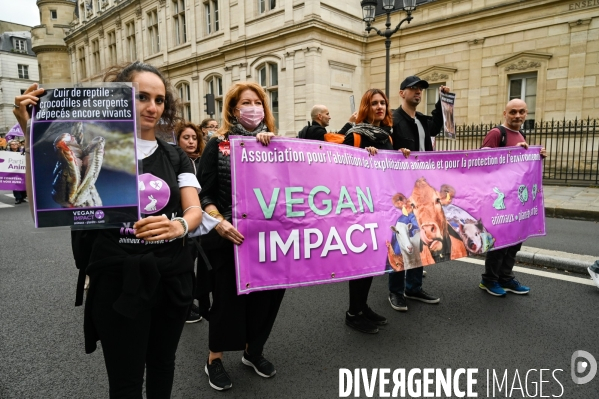 Marche contre la fourrure 2021. Les militants animalistes dénoncent la barbarie de l'exploitation de la peau des animaux, fourrure, plumes, laine. Animal activists denounce the barbarism of exploiting the skin of animals.