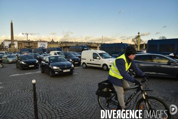 Les parisiens se déplacent en vélo, voiture par une Journée de grève des transports publics à Paris. Pas de métro, emboutaillages. Place de la Concorde.