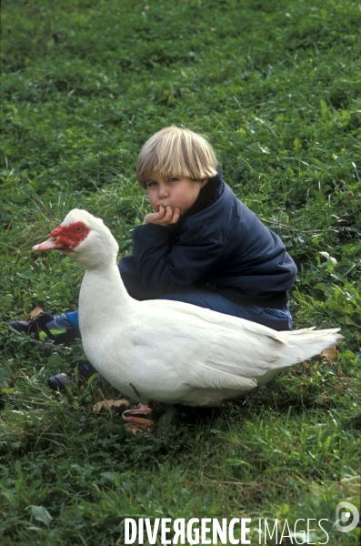 Un enfant à la campagne avec son gros canard de Barbarie blanc. A child in the countryside with his big white duck.