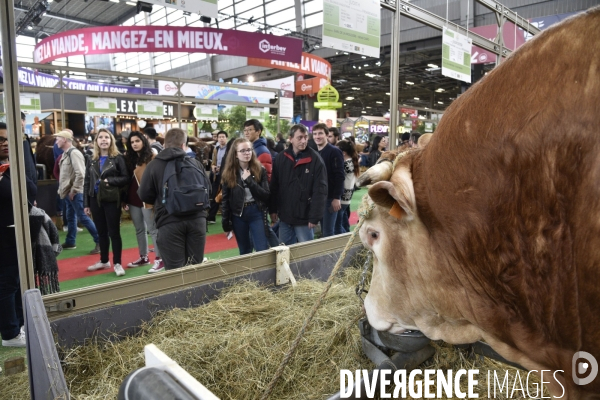 Bovin enchainé et stressé par le public au Salon de l'agriculture, devant le stand INTERBEV qui donne des cours de cuisine de viande. Stressed bull. Porte de Versailles