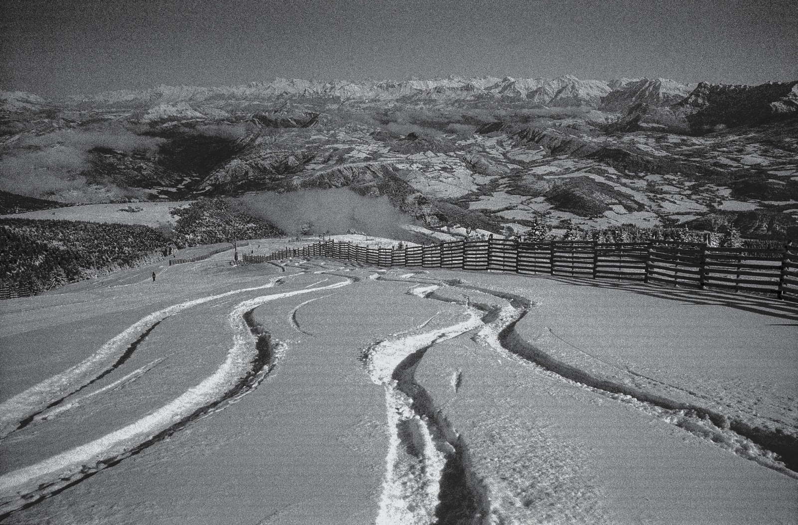 En 2016 la deuxième série de Froid Noir réutilisa les codes de la première tout juste terminée mais en changeant de technique de prise de vue et en revisitant certains lieux, mon périmètre étant relativement restreint, un cercle de 50 km de diamètre. Je changeais juste de format car un confrère venait de me refiler une boîte de 50 films 12 vues Ilford HP5 qui avait été destinée, dans les anciens temps, à alimenter les correspondants des villages qui faisaient ainsi 12 sujets sur leur bobine et l’envoyaient en Hors Sac au journal. Les bobines étaient périmées depuis l’avènement du numérique. Ce fut mou et gris, avec du grain, mais peu importe ça avait du chien et c’était gratos. Pour le prix j’ai repris l’air un hiver. Je n’ai pas photographié des gens, ou alors de loin et ça c’était une véritable récréation. Et ces photos ? Elles sont pas bien là ? à l’abri ? décontractées du grain… Et elles paraitront quand elles auront envie de paraître.