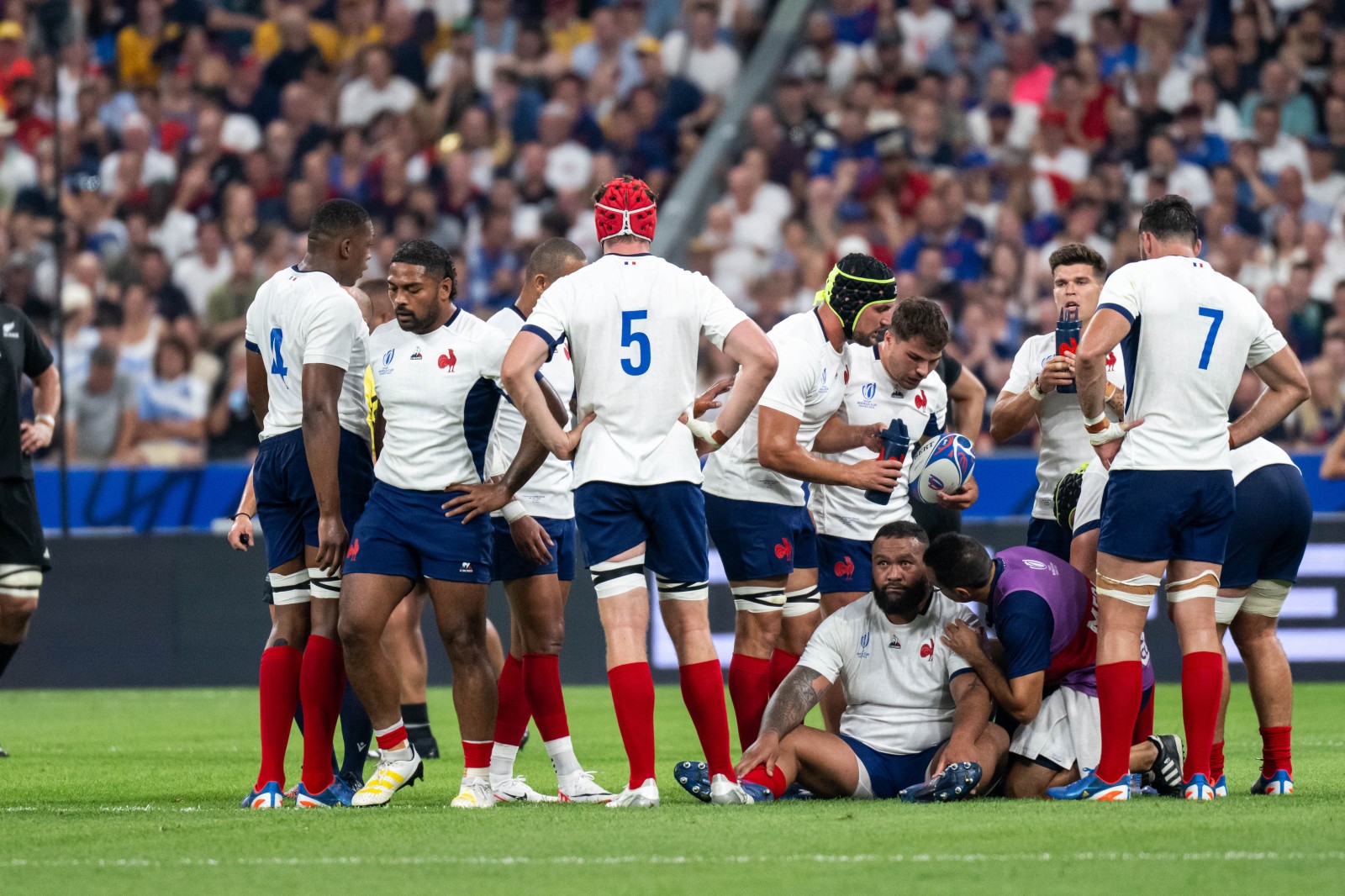 Uini Atonio examiné par le medical au milieu de Francois Cros, Antoine Dupont, Mathieu Jalibert lors du match d'ouverture de la coupe du monde de rugby au stade de France entre la France et la Nouvelle Zelande. Saint Denis, FRANCE - 08/09/2023.