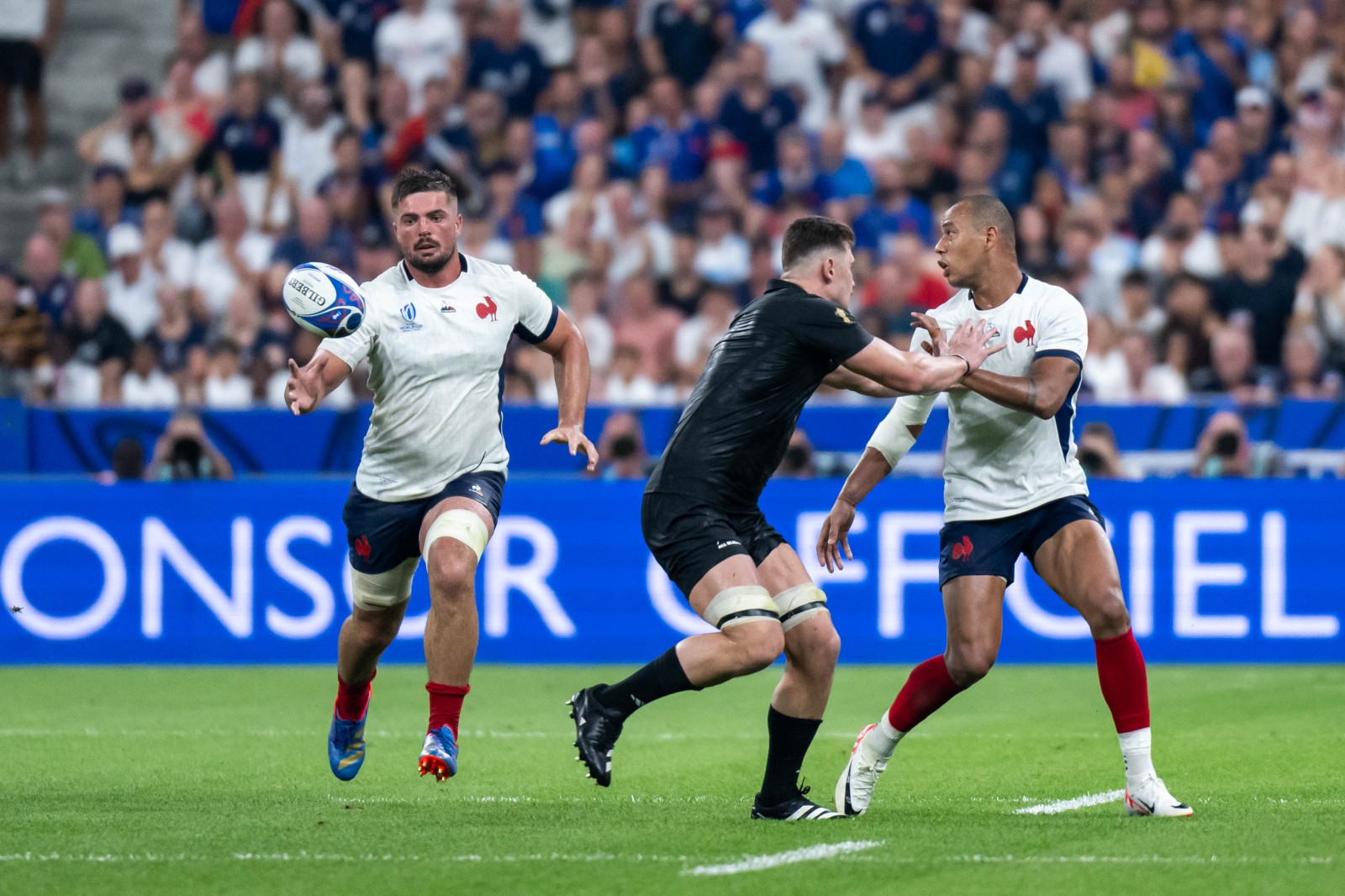 Les joueurs de l'equipe de France font un tour d'honneur (Maxime Lucu, Melvyn Jaminet) lors du match d'ouverture de la coupe du monde de rugby au stade de France entre la France et la Nouvelle Zelande. Saint Denis, FRANCE - 08/09/2023.