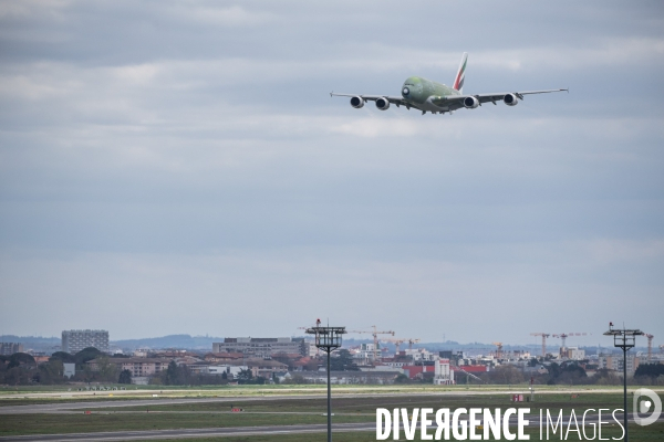 Passage bas au dessus de l'aeroport et de l'usine d'assemblage Lagardere apres le decollage du dernier A380 fabrique et assemble a Toulouse popur la compagnie Emirate dans les usines d'AIRBUS. Depart pour Hambourg depuis l'aeroport de Toulouse Blagnac. Toulouse, FRANCE - 17/03/2021.