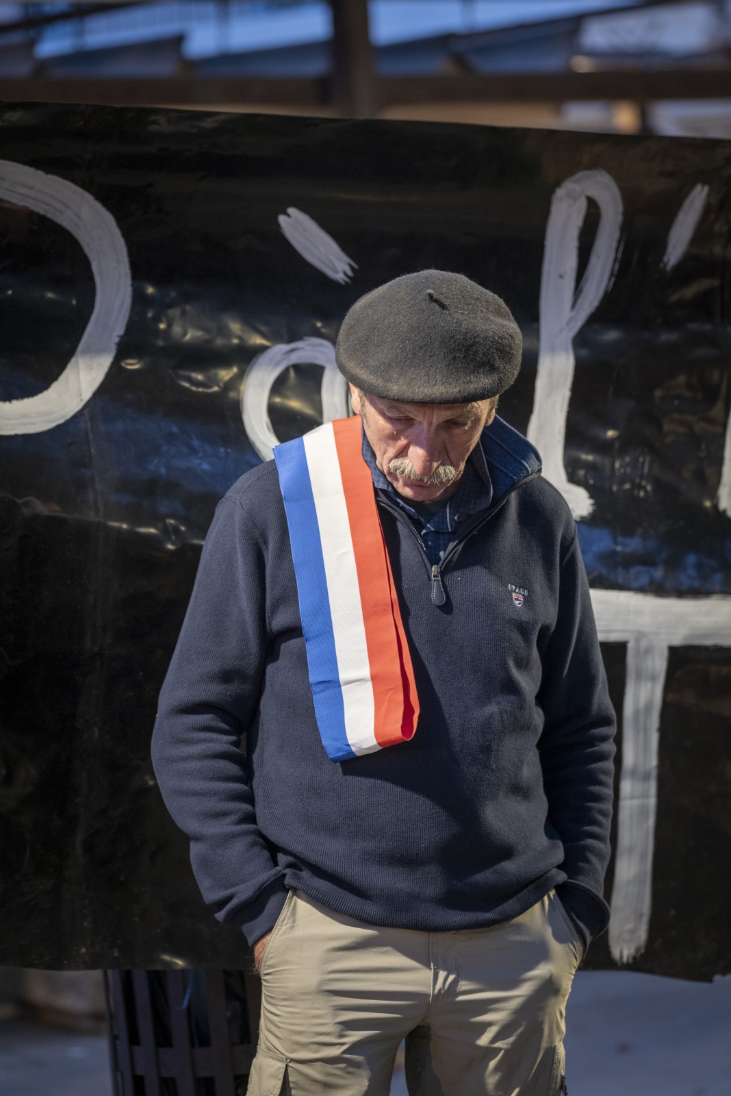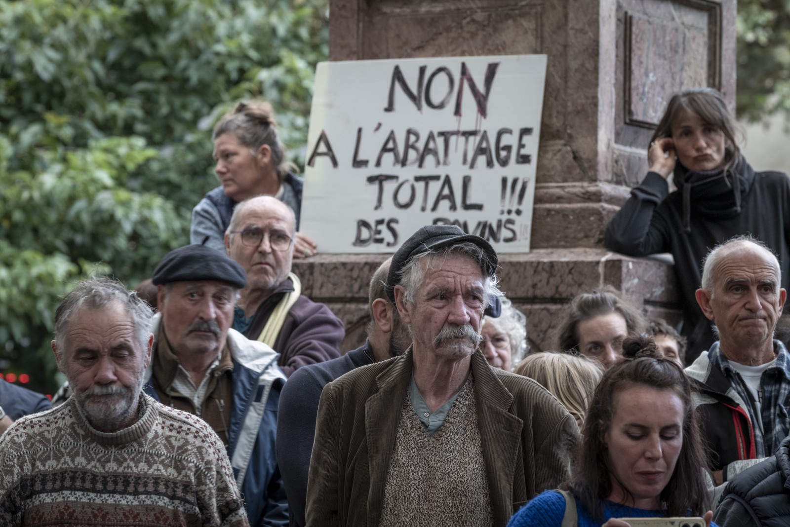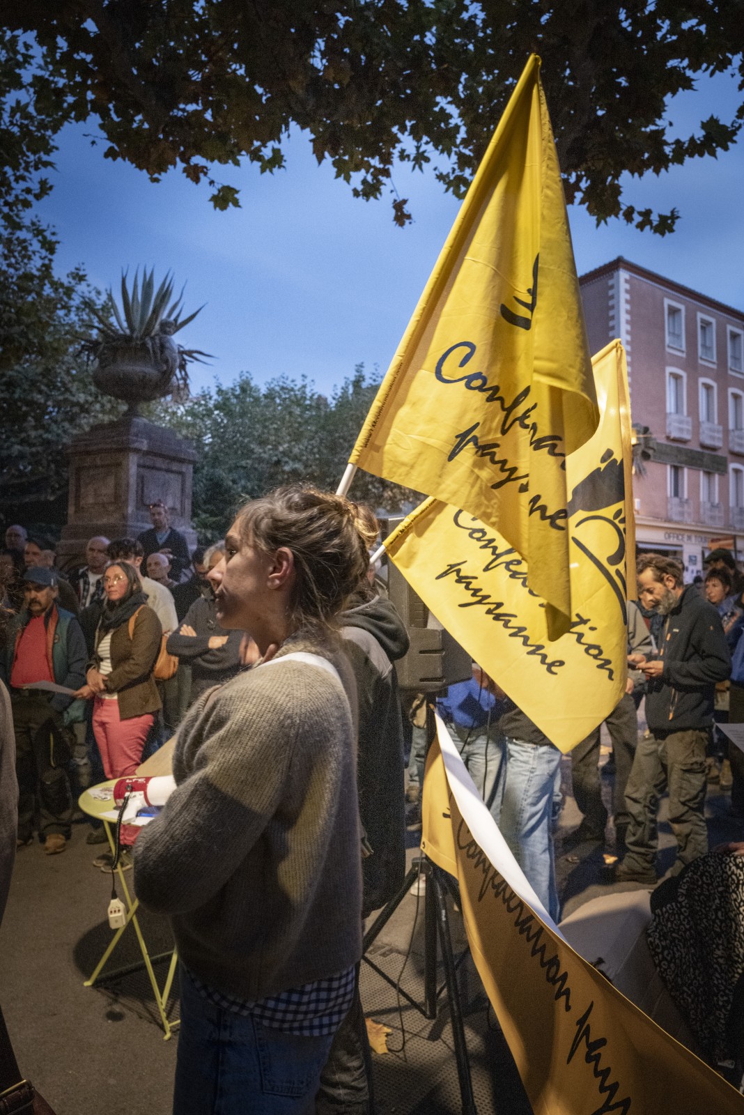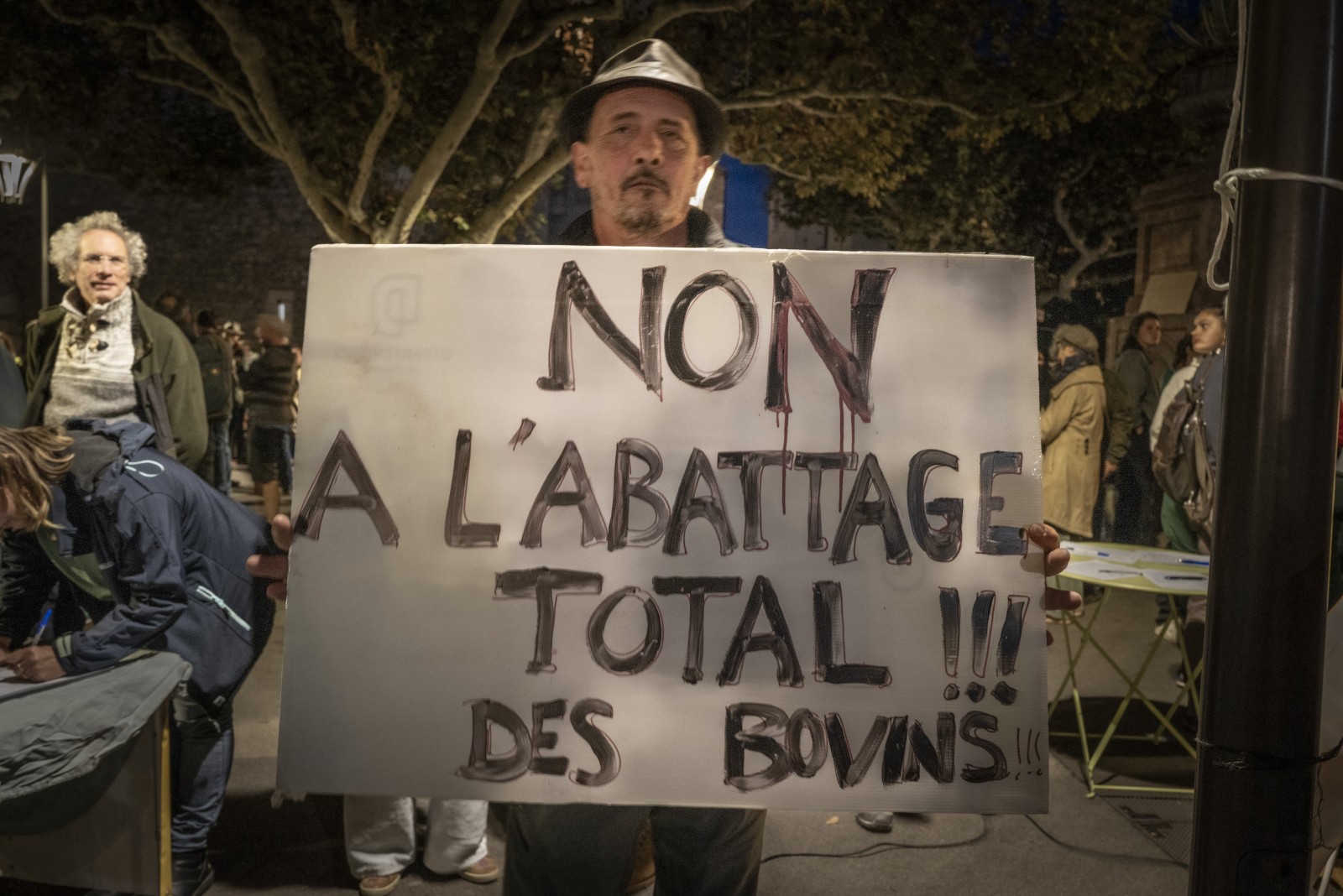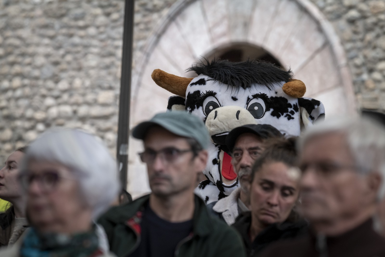 FRANCE/.PRADES/2025OCT29/ AGRICULTURE/.ELEVAGE/ A l'appel d'organisations paysannes (Confederation paysanne, coordination rurale) pres de deux cents personnes se sont rassemblees a Prades(66) pour protester contre l'abattage total des troupeaux de bovins en cas de contamination par le virus de la dermatose bovine. Plusieurs eleveurs du département ont vu leur cheptel abattu pour un ou deux cas d'infection non transmissible à l'homme. © Georges BARTOLI / Divergence-images.com