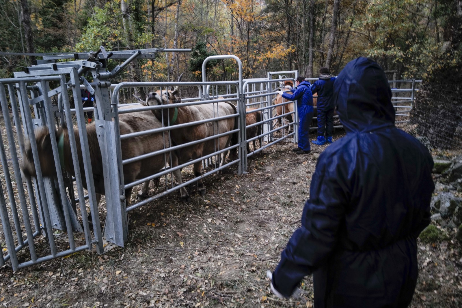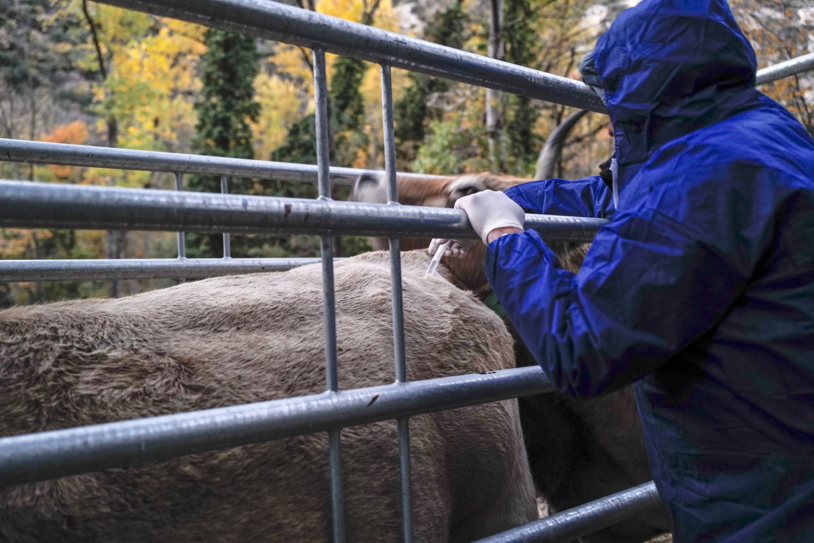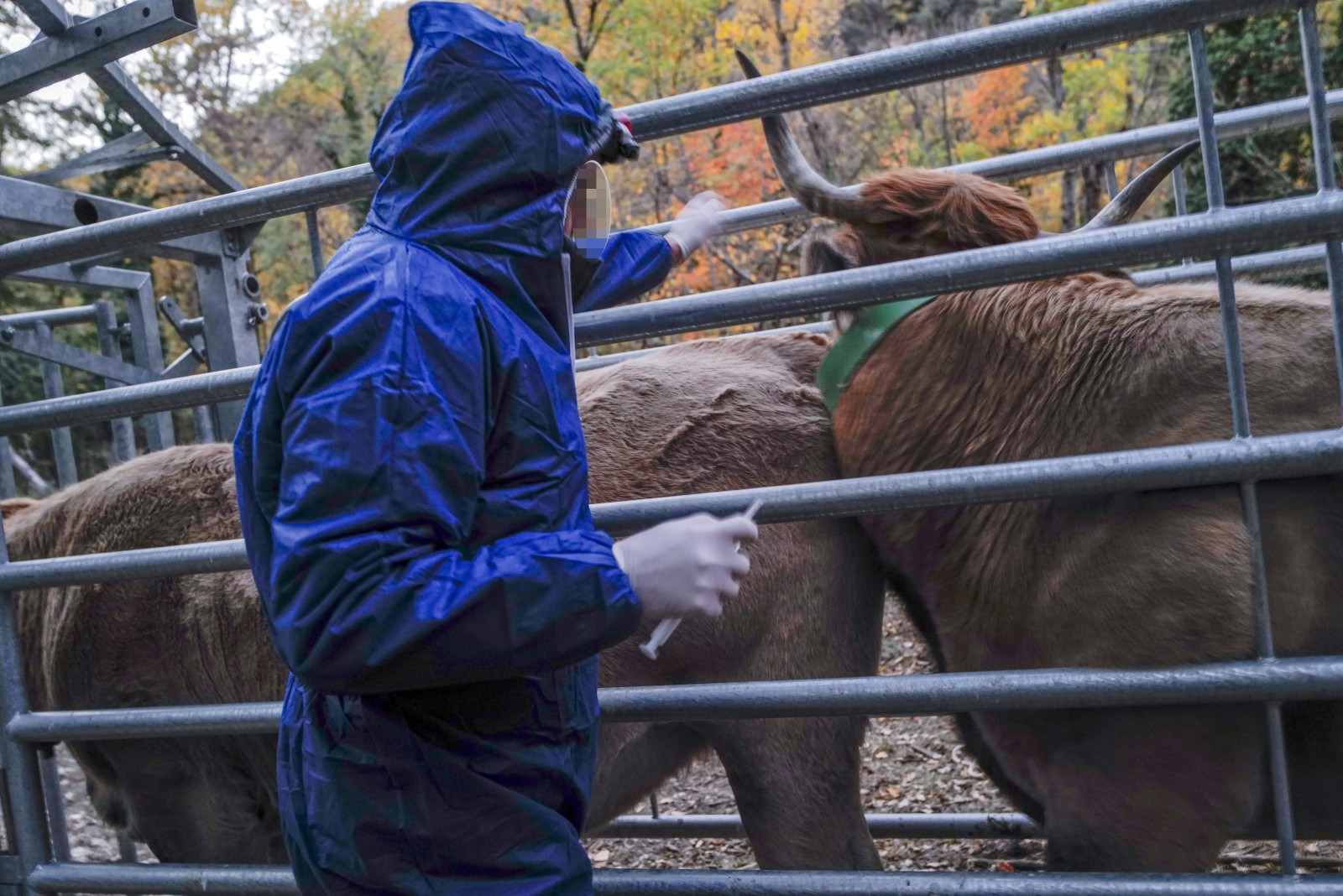 FRANCE/THUES entre VALLS(66°ELEVAGE) EPIDEMIE/ Les organisations agricole en particulier le Confederation Paysanne s'opposent a l'abattage systématique du troupeau. l'Abattaage aura bien lieu à la tombee de la nuit. Des techniciens des services veterinaires mettent en place le dispositif d'abattage.Le veterinaire inicule une dose de sedatif a chaque bete avnt une deuxieme dose mortelle. © Georges BARTOLI / Divergence-images.com