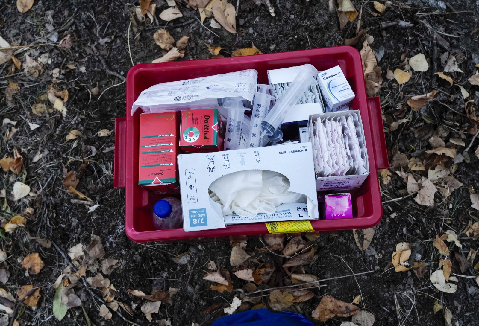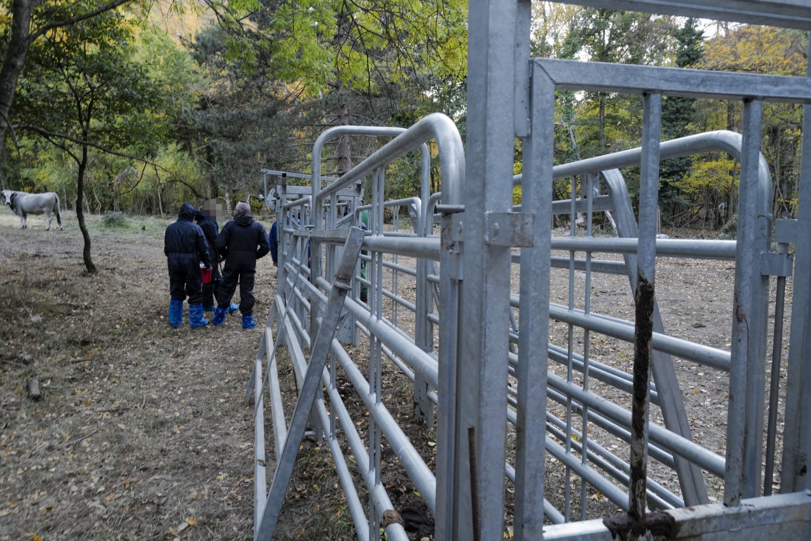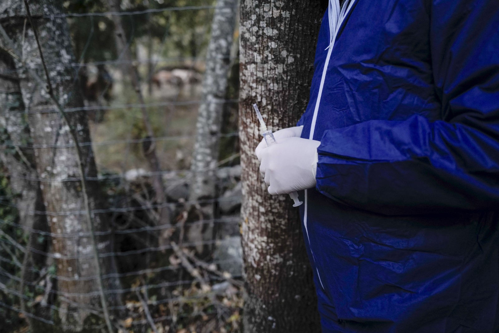 FRANCE/THUES entre VALLS(66°ELEVAGE) EPIDEMIE/ Les organisations agricole en particulier le Confederation Paysanne s'opposent a l'abattage systématique du troupeau. l'Abattaage aura bien lieu à la tombee de la nuit. Des techniciens des services veterinaires mettent en place le dispositif d'abattage.Le veterinaire inicule une dose de sedatif a chaque bete avnt une deuxieme dose mortelle. © Georges BARTOLI / Divergence-images.com