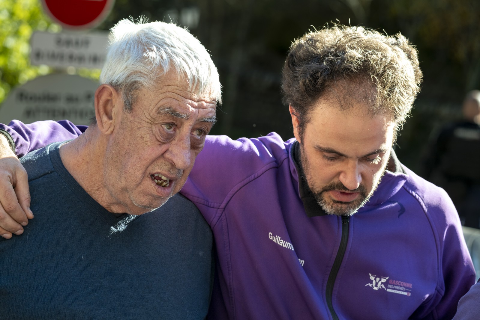 FRANCE/.REAL/66/elevage/ DERMATOSE BOVINE NODULAIRE/2024NOV07/ Pierre (jeune) et Robert REGNE eleveurs dont le troupeau vaccine est consigne sur l'estive examinent regulierement leurs betes dans l'attente du délai d'incubation de 21 jours de la dermatose nodulaire bovine qui pourrait menacer leurs vaches Aubrac et conduire a l'abattage total du troupeau. A une semaine de l'expiration aucun signe n'est encore visible. © Georges BARTOLI / Divergence-images.com