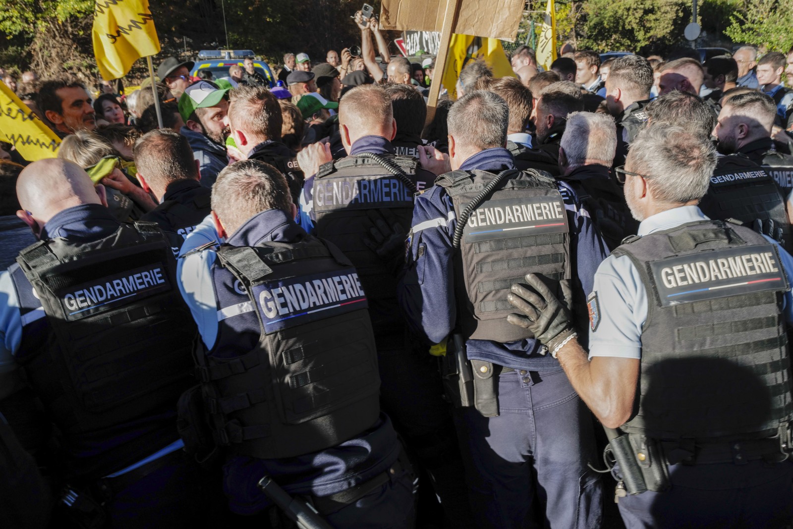 FRANCE/THUES entre VALLS(66°ELEVAGE) EPIDEMIE/ DEs manifestants venus de plusieurs departements du sud tentent de bloquer l'acces aux equipes veterinaires venues abattre deux troupeaux de bovins dont certaine betes sont atteinte de la dermatose bovine. Les organisations agricole en particulier le Confederation Paysanne s'opposent a l'abattage systématique du troupeau. l'Abattaage aura bien lieu à la tombee de la nuit. © Georges BARTOLI / Divergence-images.com