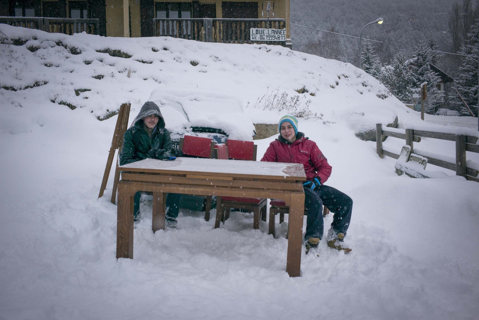 FRANCE/ LES ANGLES/SAISONNIERS/2016MAR13/ De jeunes saisonniers venus tenter de trouver un travail dans la station de ski de Les Angles vivent dans des camions amenages sur l'un des parkings de la station .Repas de fin de saison dans le camion de Julie et Alex. En attendant le.s invites © Georges BARTOLI / Divergence
