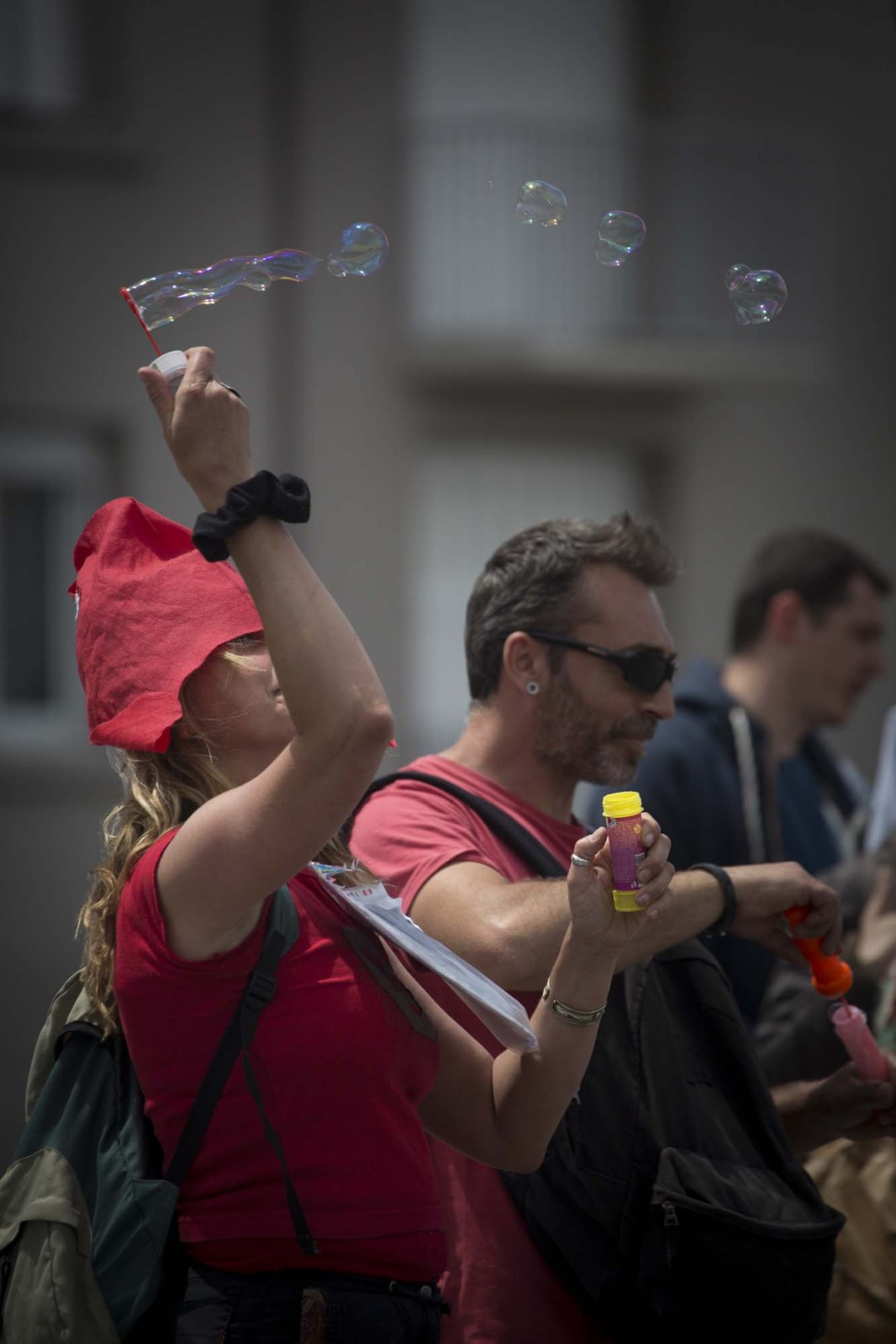 FRANCE/PERPIGNAN/2016MAY26/Des syndicalistes de la CGT et de FO bloquent la gare SNCF de Perpignan et un TGV franco espagnol partant pour Barcelone pour protester contre le projet de loi Travail dite Loi El Khomri.Une manifestante produit des bulles de savon pour railler la police municipale qui a verbalise deux jours auparavant un artiste de rue qui en faisait en public. © Georges BARTOLI / Divergence