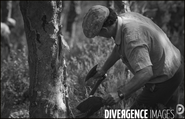 FRANCE/LIEGE/ARCHIVES/1989JUN/10/Levage liege dans la suberaie de Les Cluses par des ouvriers espagnols. Ce liege est destine a la fabrication industrielle de bouchons a vin au Boulou ou a Ceret. © Georges BARTOLI / Divergence